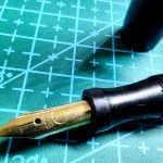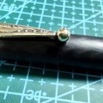 – Bloc plume Ebonite noire. Petite rayure. Plume Or – Taille Fine à moyenne.