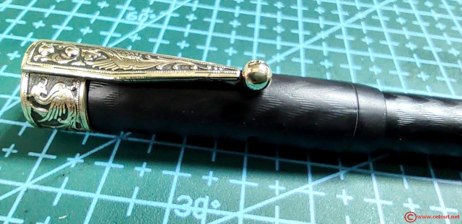 – Capuchon en Ebonite noire. Clip métal doré avec motif classique. Tres Bon état global.