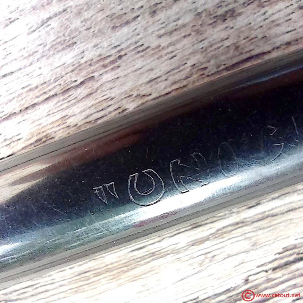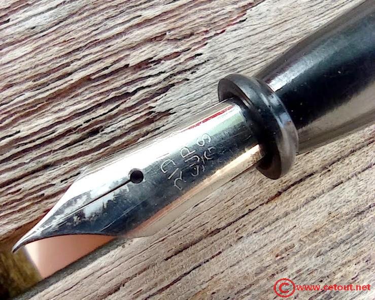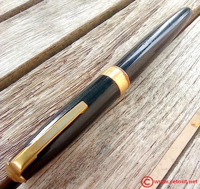 – Capuchon (intact) – Celluloid(?) NOIR – capot supérieur et clip doré. Bague dorée à la base (traces d’oxydation et/ou usure).