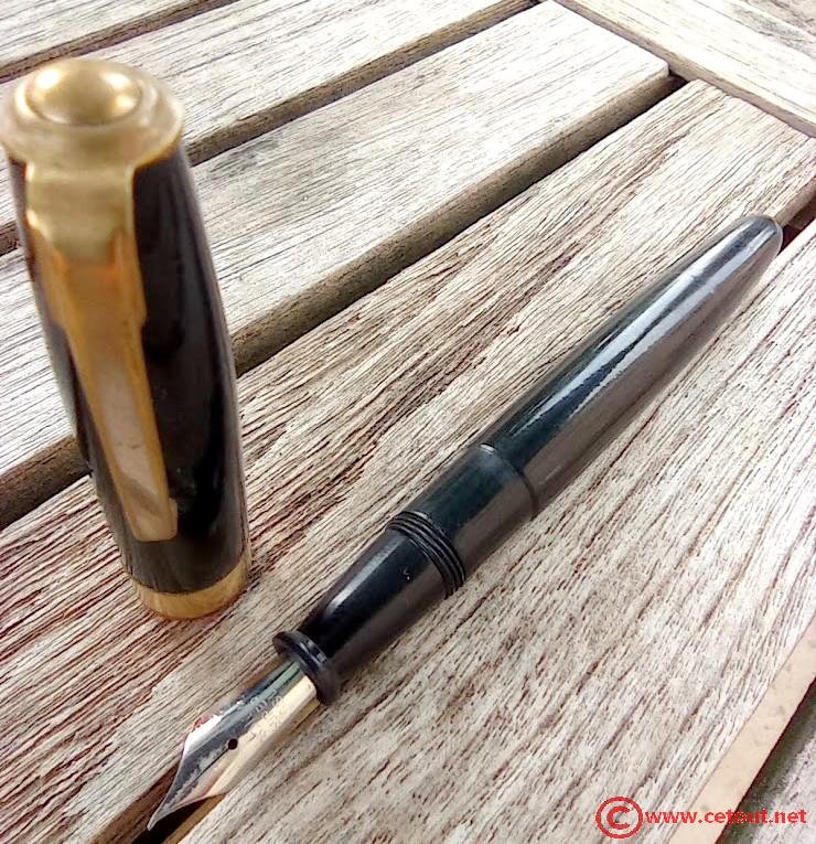 – Corps Celluloid(?) NOIR. Capot doré en extrémité. Système a bouton (non restauré)