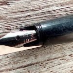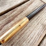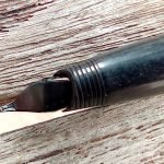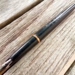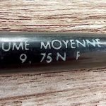 – Corps plastique (celluloïd?) noir . Aucune inscription gravée mais marquage vente ” Plume Moyenne 9,75 NF”.