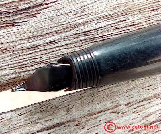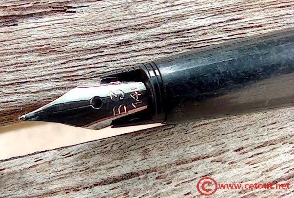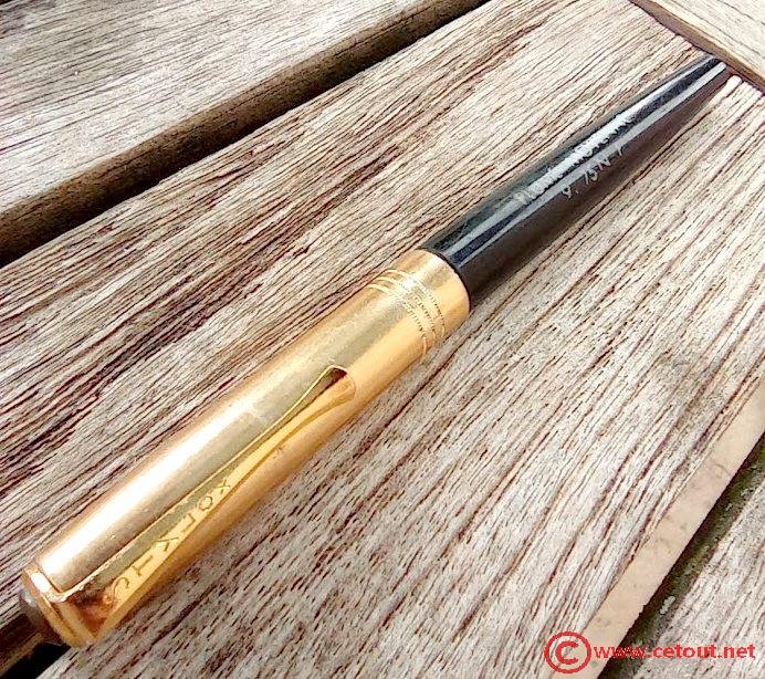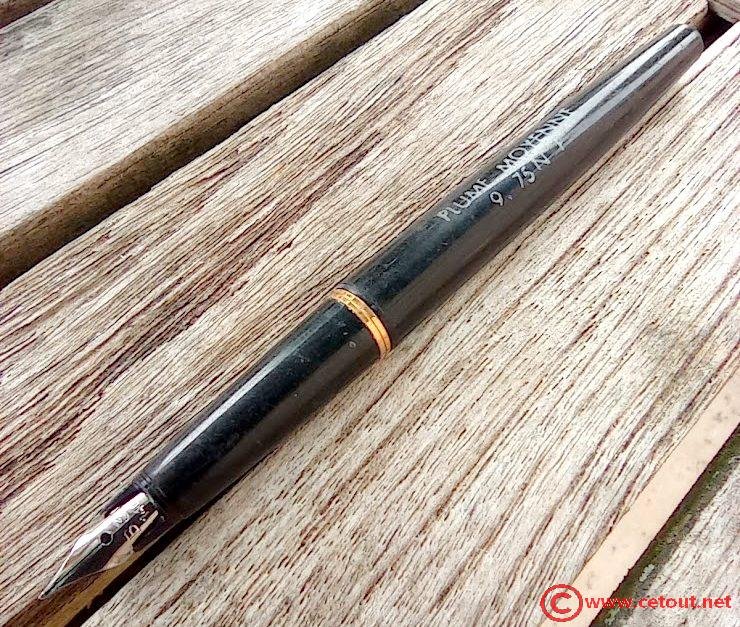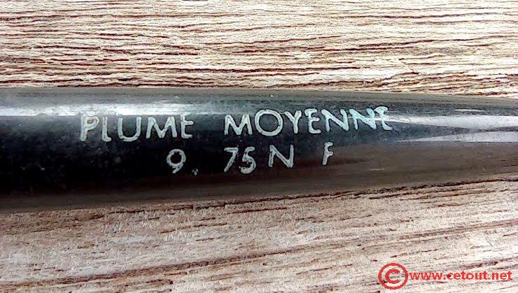 – Corps plastique (celluloïd?) noir . Aucune inscription gravée mais marquage vente ” Plume Moyenne 9,75 NF”.