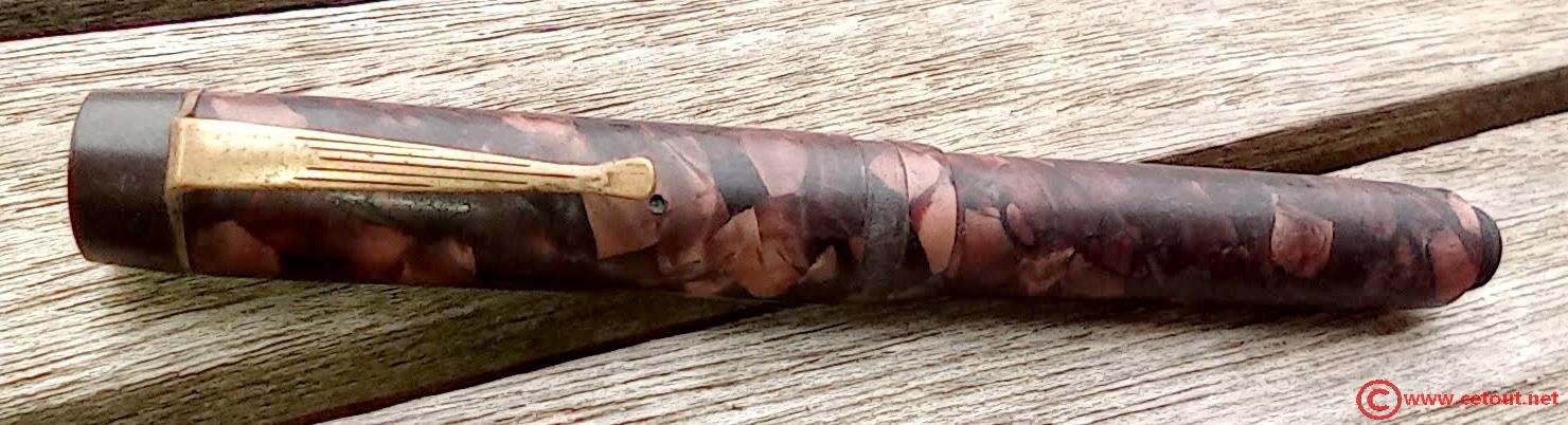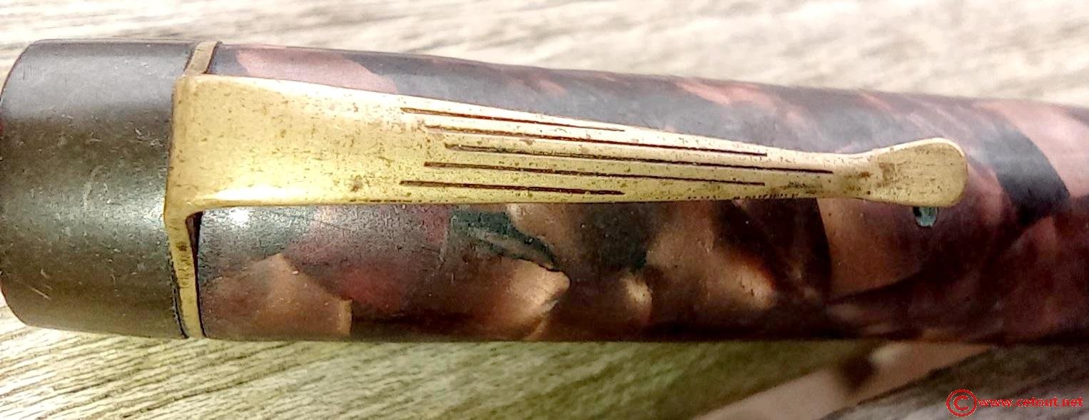 – Capuchon en celluloïd? marbrée (Marbré Ocre Rouge Nacre). Clip décoré en laiton (?). Bon état global.