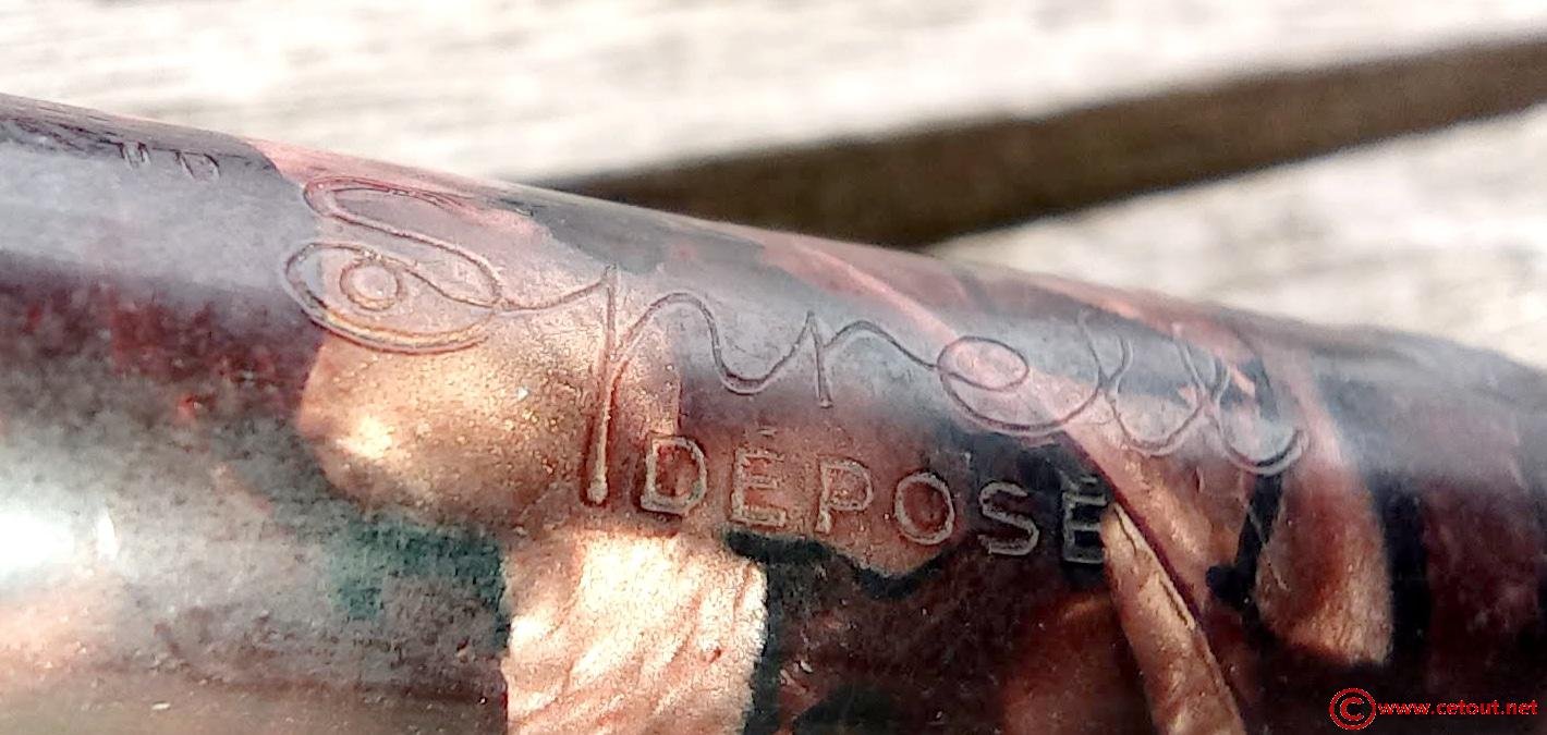 – Corps celluloïd? marbrée (Marbré Ocre Rouge Nacre). Gravure stylisée “SPRELL” puis “DEPOSE” . Mécanisme à bouton non fonctionnel.