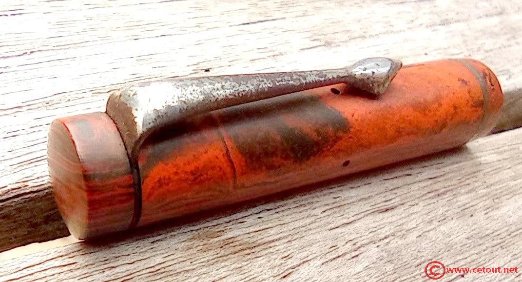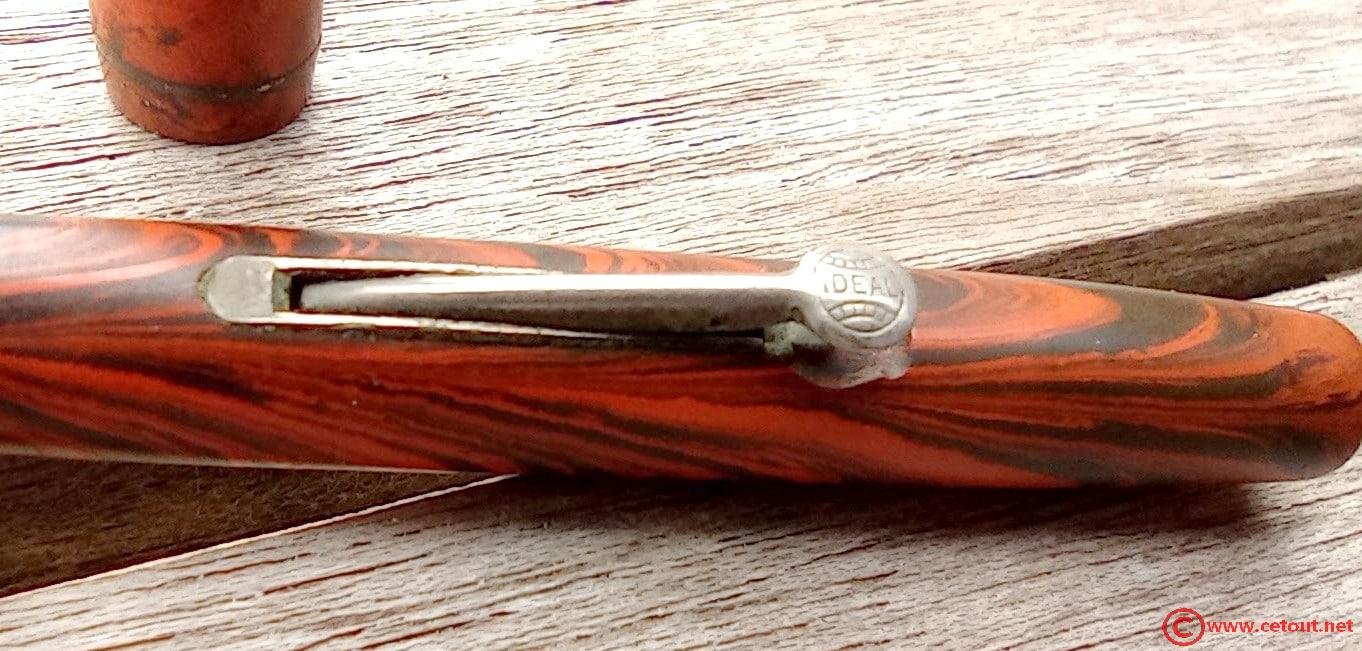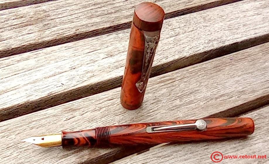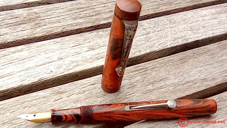 – Capuchon Ebonite woodgrain (assurément non d’origine) avec clip oxydé. Bon état du corps du capuchon et du chapeau.