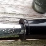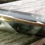 – Capuchon en celluloïd? MARBRE VERT NACRE. Agrafe en métal doré. Très Bon état global. Deux encoches à la base du capuchon laissent penser que 2 bagues sont manquantes. Rétractation de la matière?