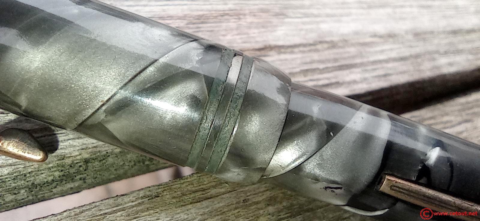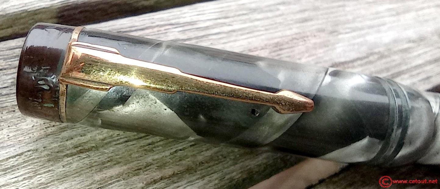 – Capuchon en celluloïd? MARBRE VERT NACRE. Agrafe en métal doré. Très Bon état global. Deux encoches à la base du capuchon laissent penser que 2 bagues sont manquantes. Rétractation de la matière?