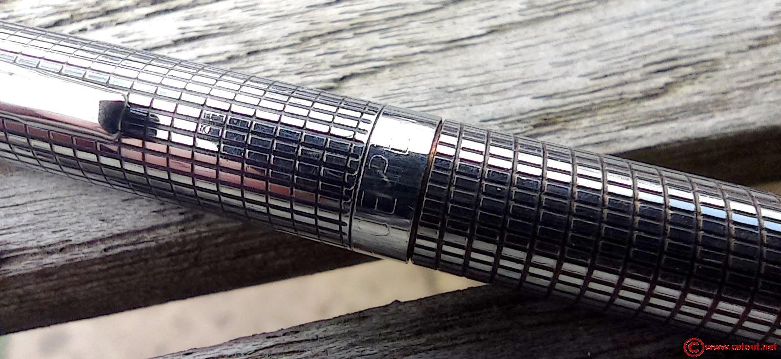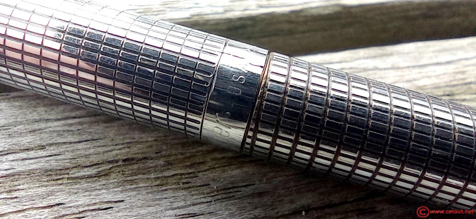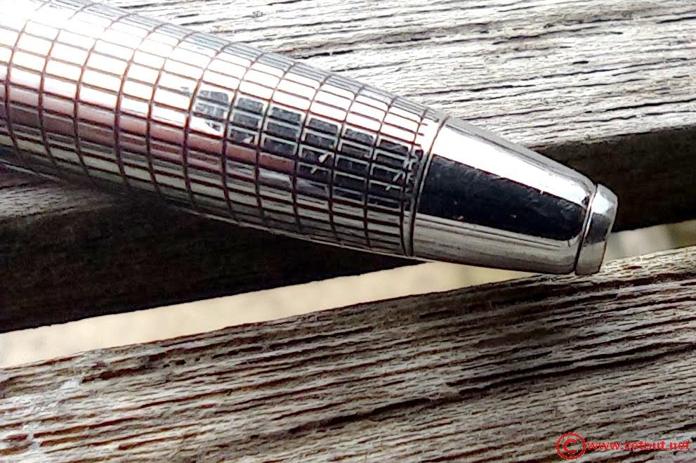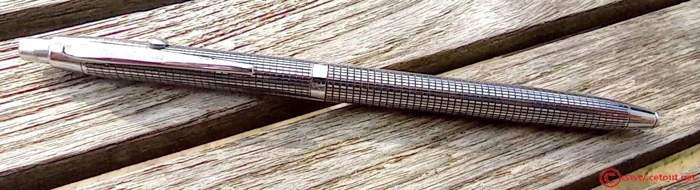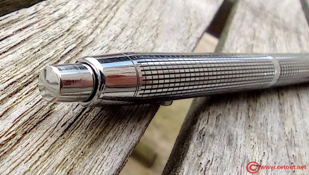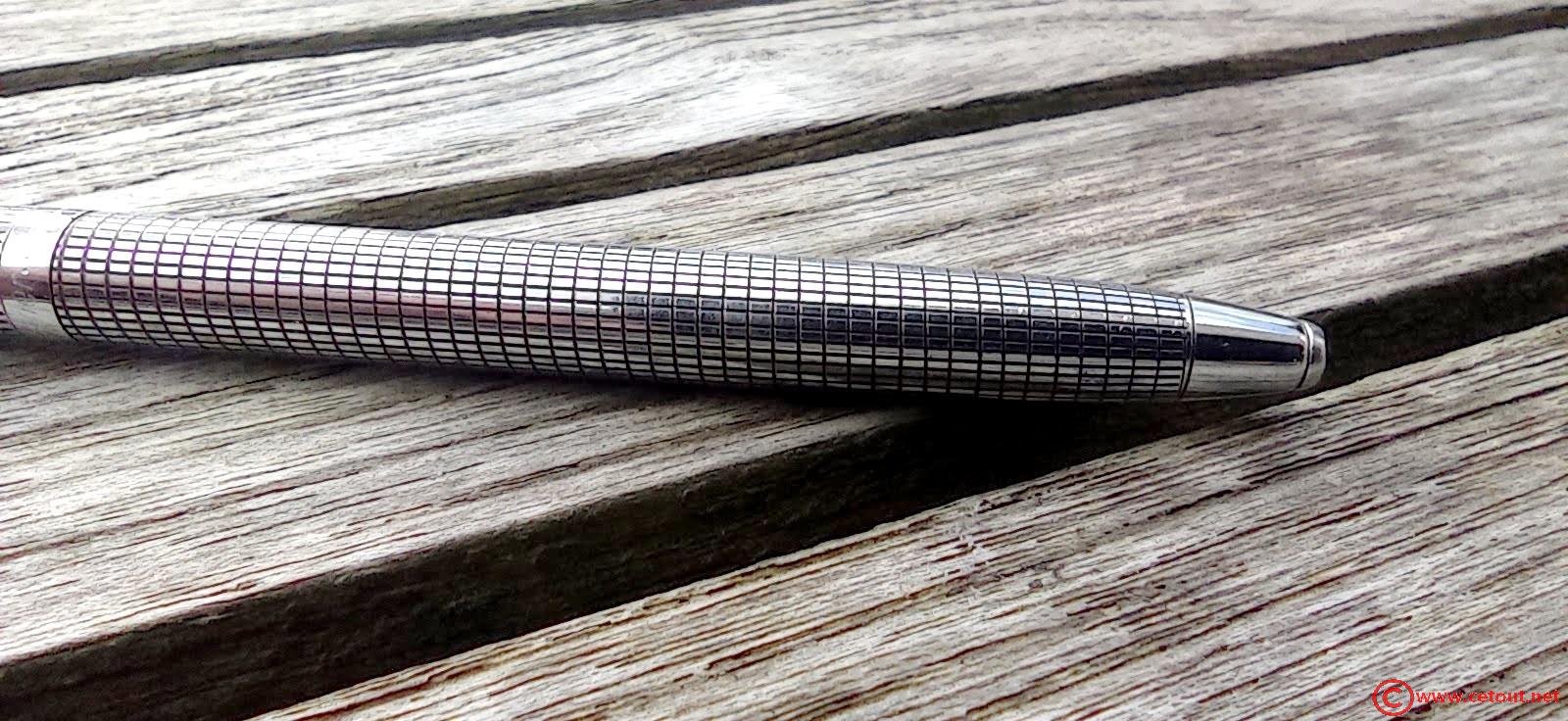 Stylo entièrement en métal chromé quadrillé.
