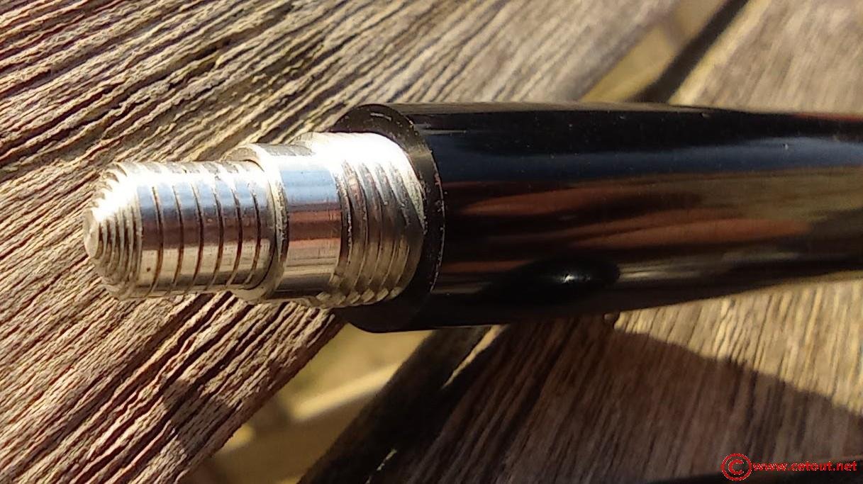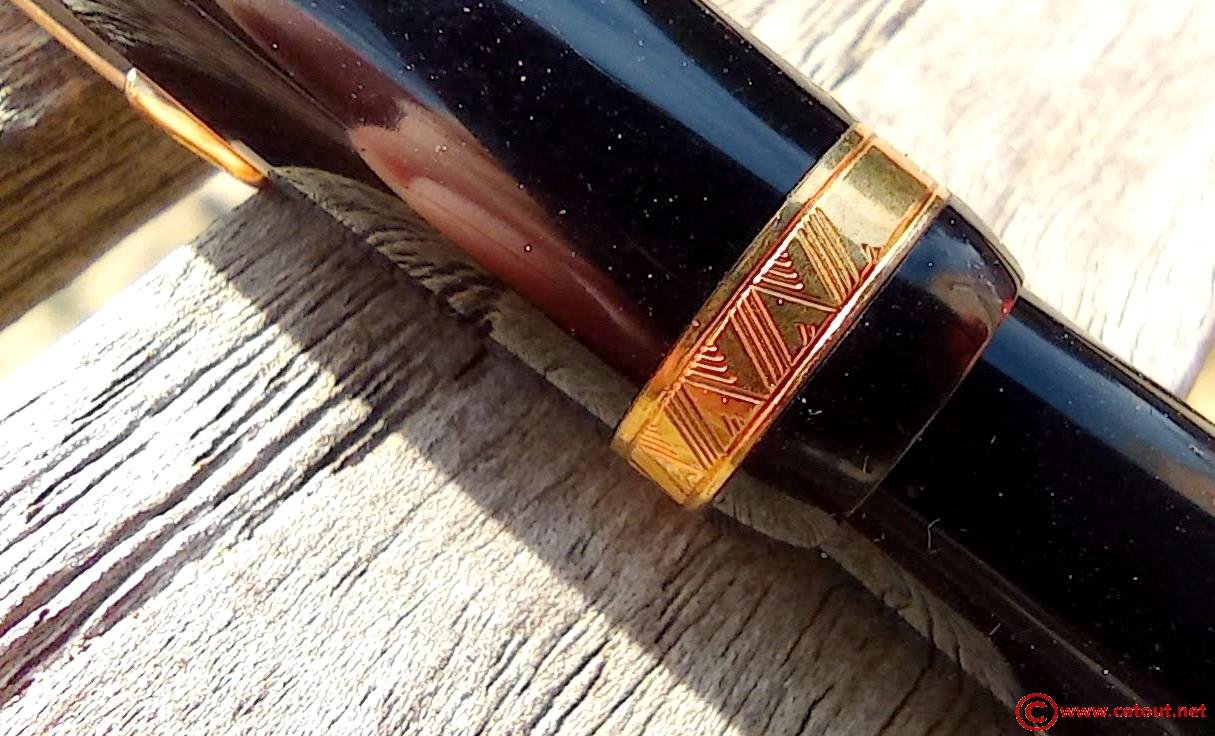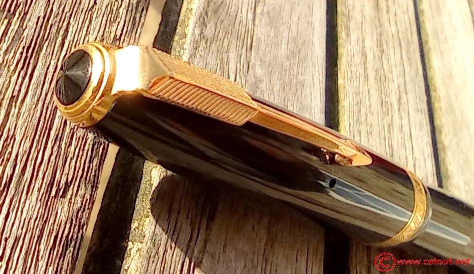– Capuchon (intact) CELLULOID (?) noire – clip PARKER Simple “jewel” noire. Bagues large à la base. Motifs chevrons en quinconces.