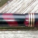 – Capuchon en celluloïd? marbré rouge et noir. Très Bon état global. 3 Bagues à la base du capuchon. Bélière en métal doré avec anneau.