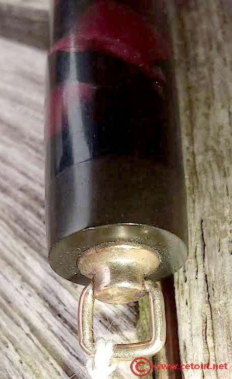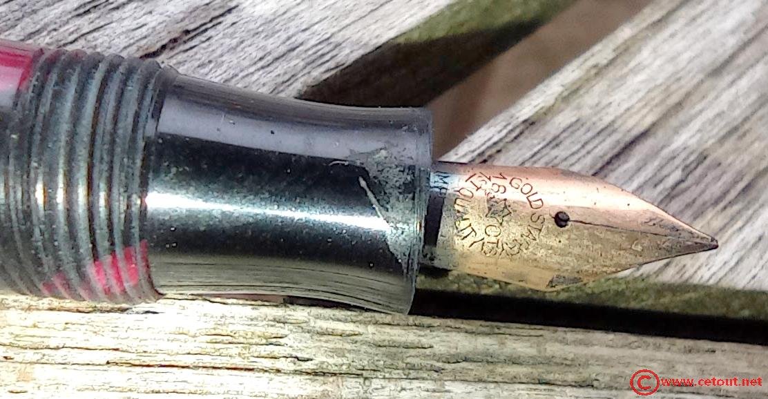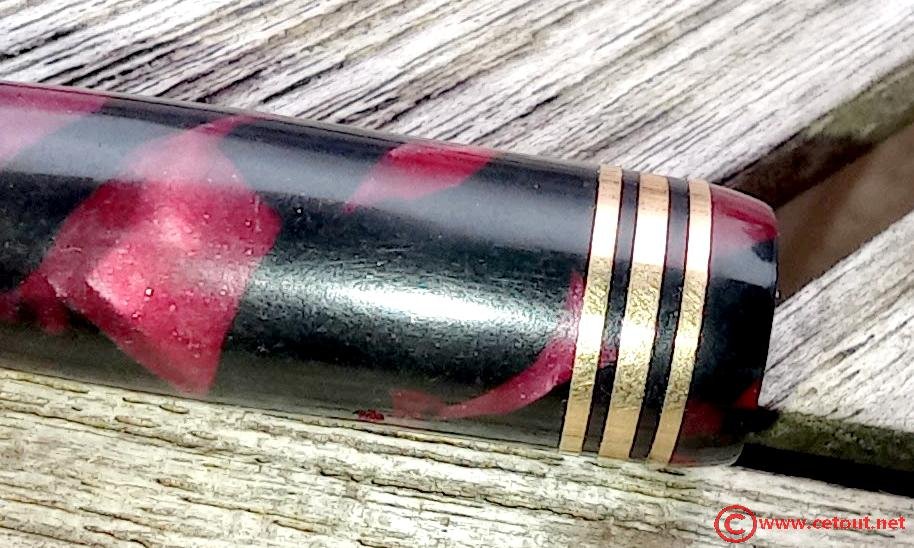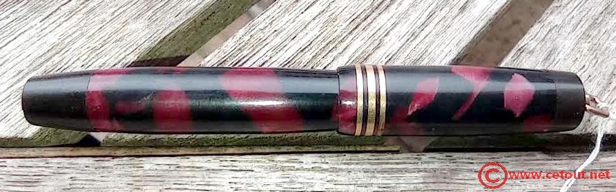 – Capuchon en celluloïd? marbré rouge et noir. Très Bon état global. 3 Bagues à la base du capuchon. Bélière en métal doré avec anneau.