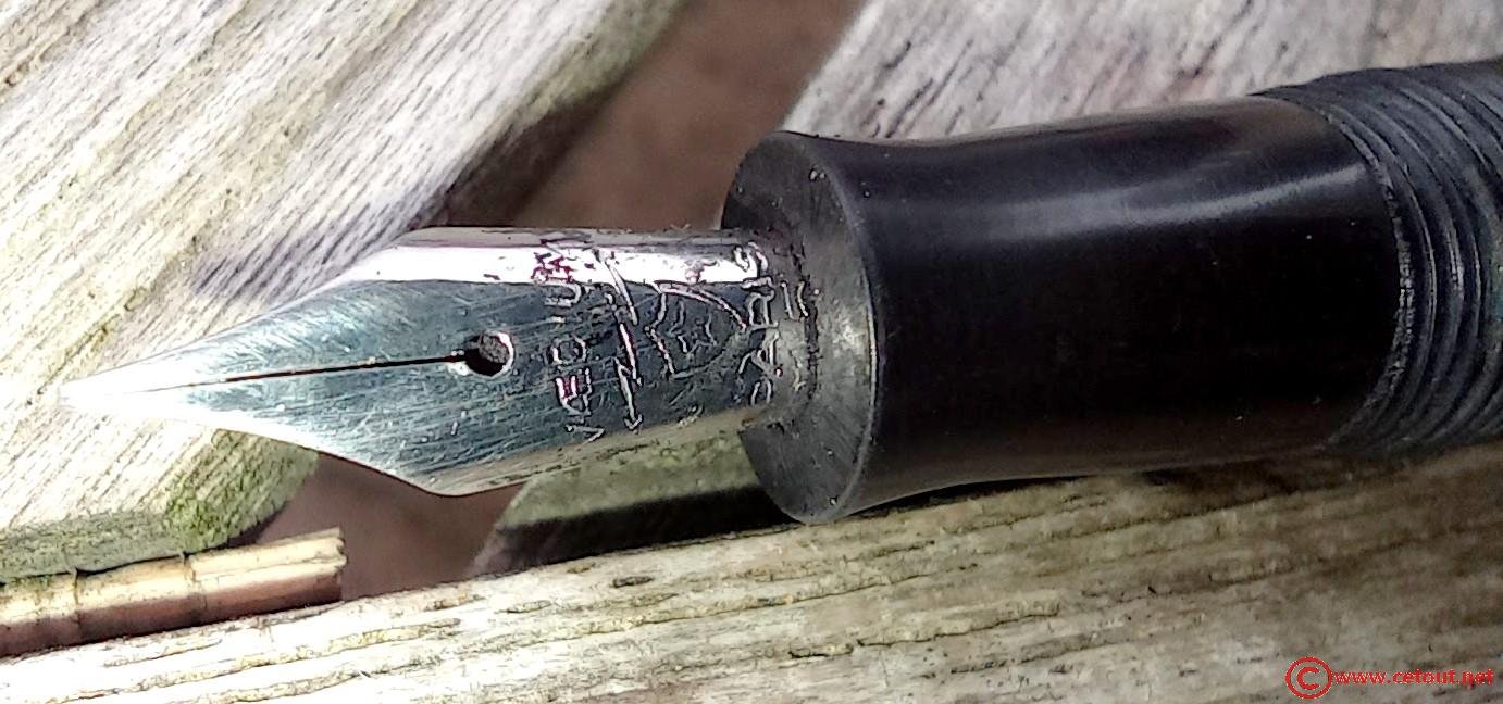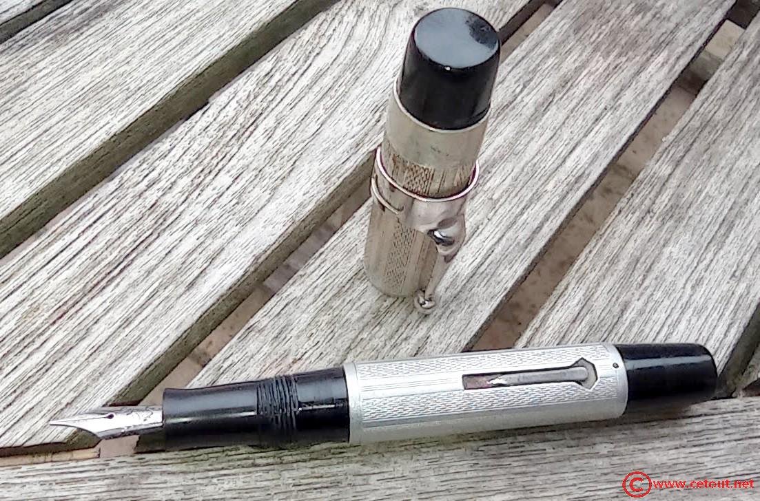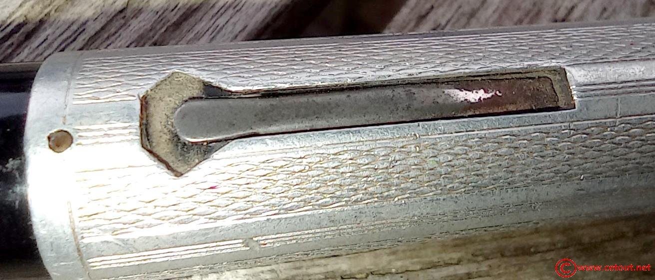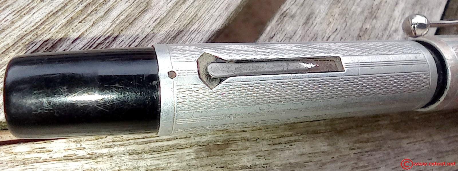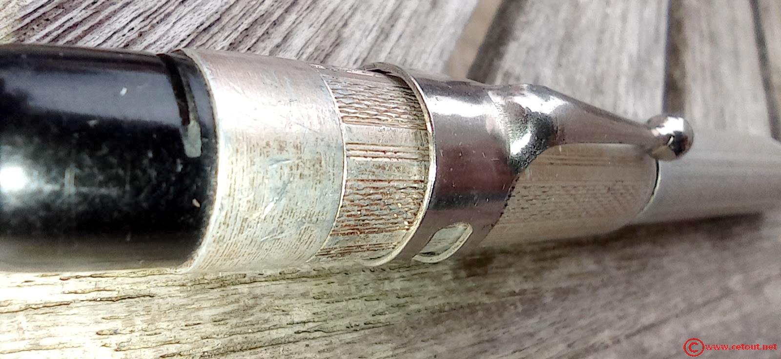 – Corps plastique (celluloïd ou ébonite?) noir recouvert d’un habillage métal avec motifs et guillochage . Aucune inscription.