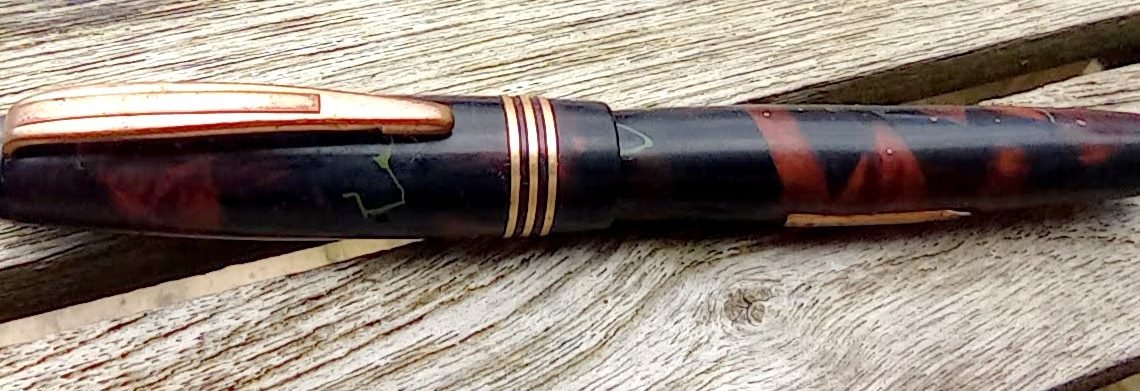 – Capuchon en Celluloïd (?) marbré rouge et noir avec quelques zébrures vertes . Clip doré avec doublure intérieure en relief. 3 bagues dorées à la base. Bon état global.