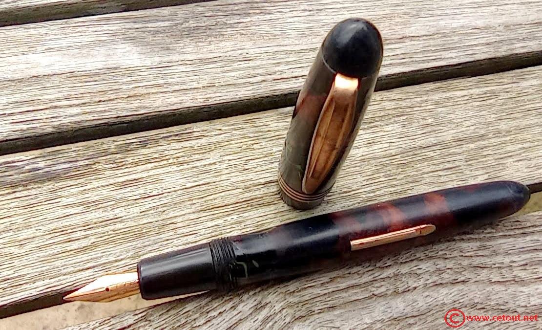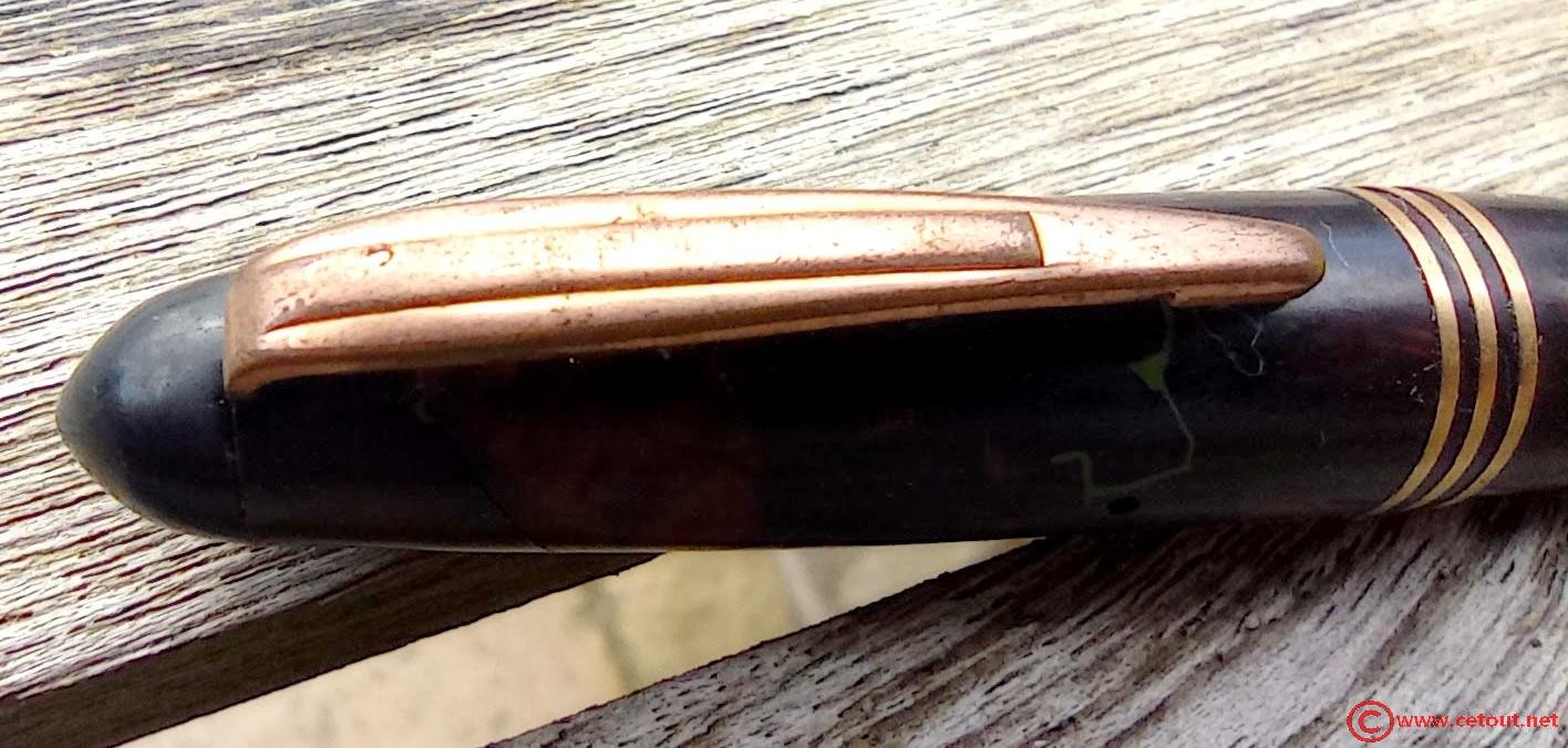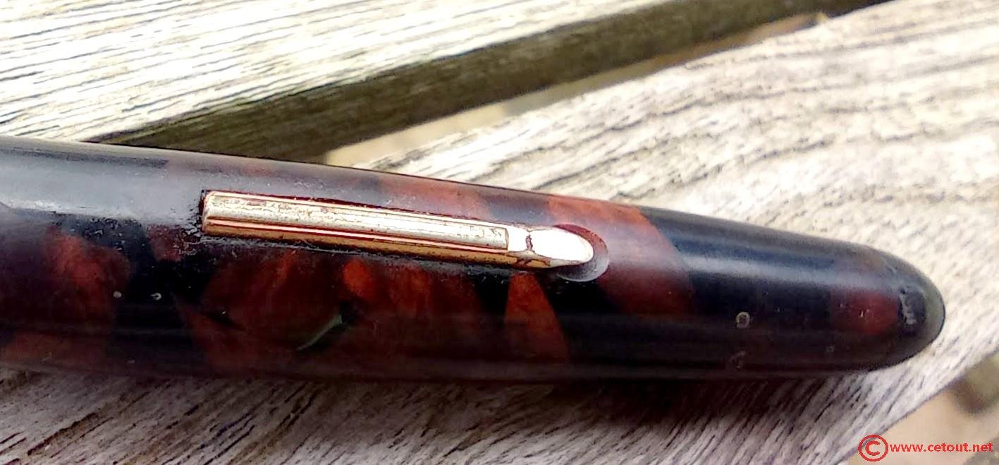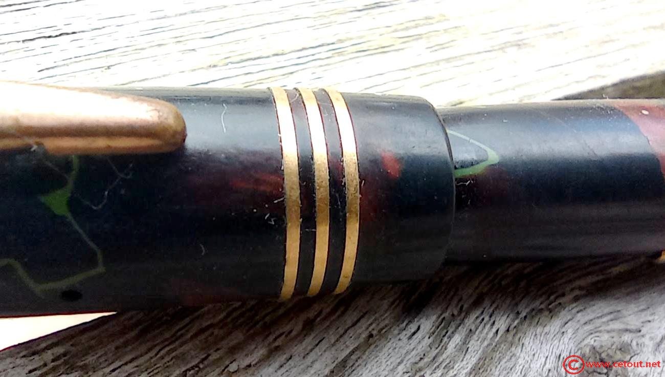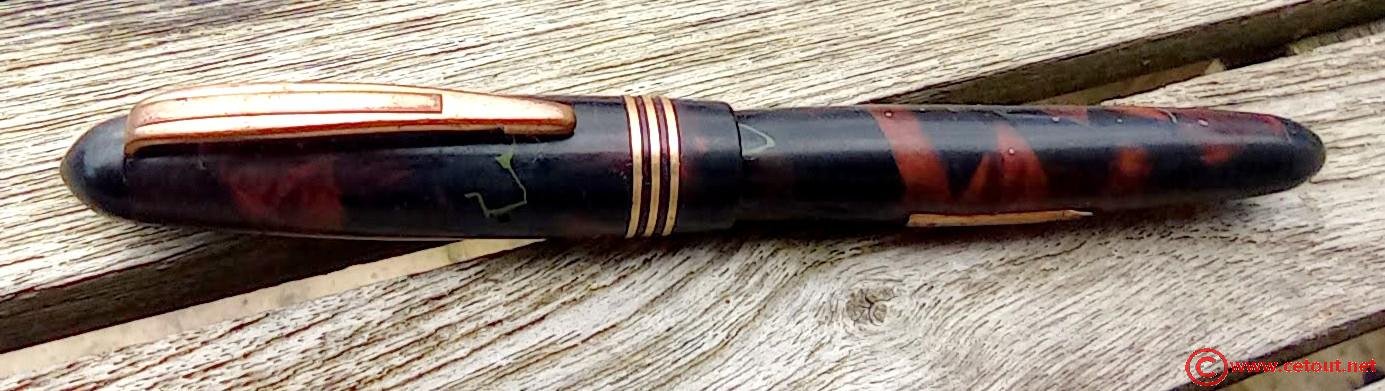 – Capuchon en Celluloïd (?) marbré rouge et noir avec quelques zébrures vertes . Clip doré avec doublure intérieure en relief. 3 bagues dorées à la base. Bon état global.