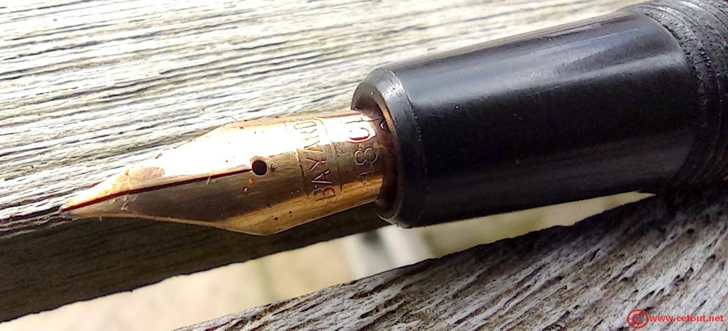 – Bloc plume Celluloïd (?) noir. Plume OR (non démontée) – « BAYARD 18 Ct reste caché ».