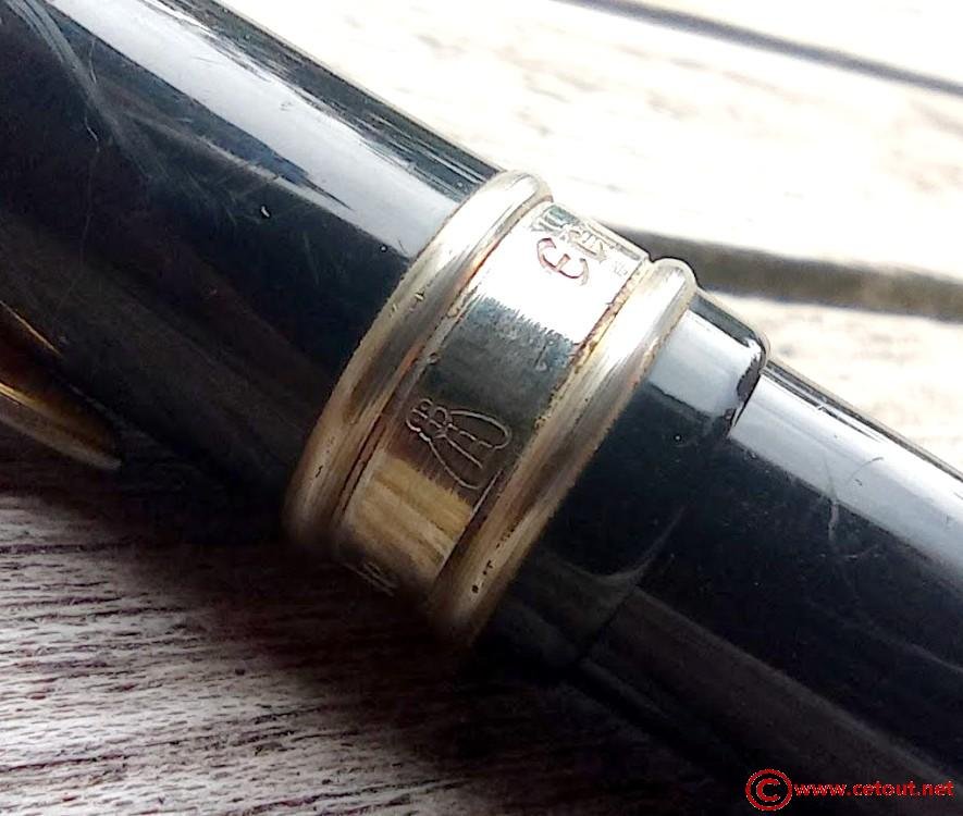 – Capuchon (intact) : Métal laqué noir – Agrafe avec gravure abeille et forme d’un couteau de la marque. Gravure CM 93 (?) sur la partie imitant la lame de couteau. Une bague Annelée en métal avec gravé : “LAGUIOLE + abeille + ECRITURE”