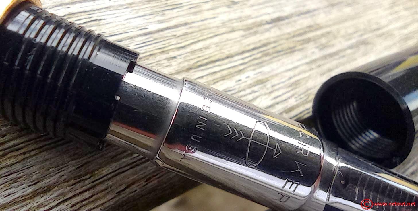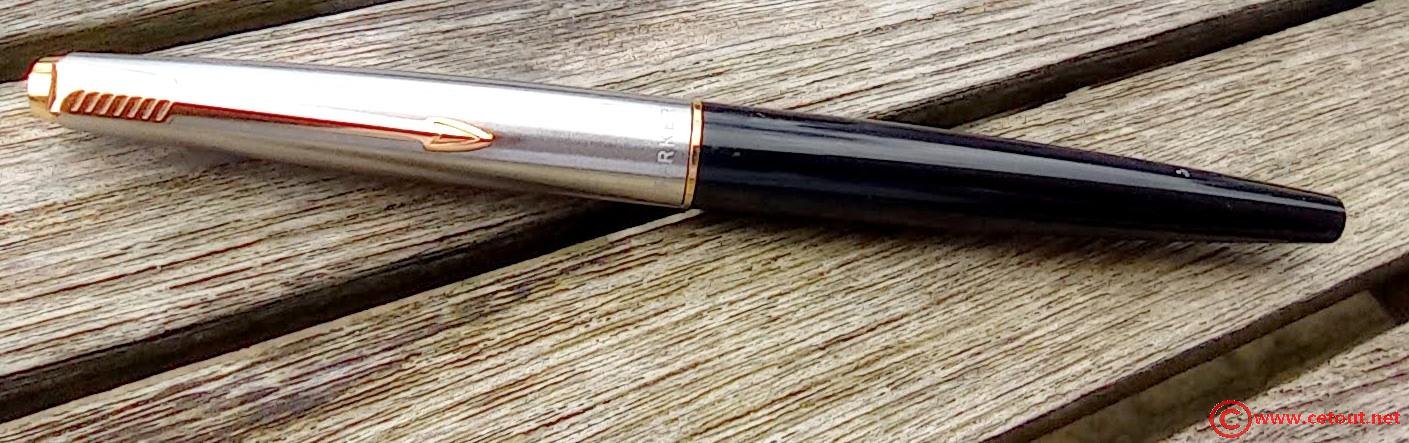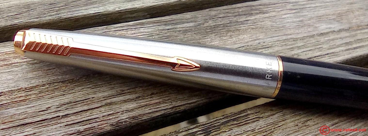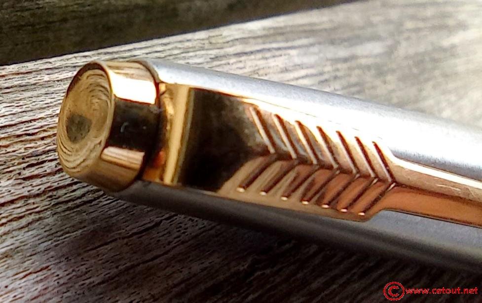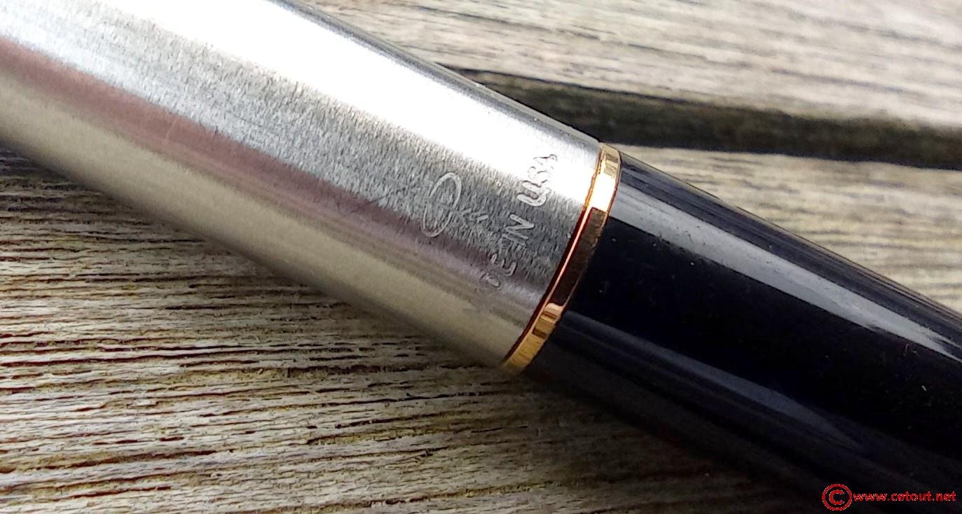 – Capuchon (intact) – métal brossé – agrafe flèche . Bague au sommet. Inscriptions : « Symbole flèche et cercle » suivi de « PARKER – MADE IN USA »