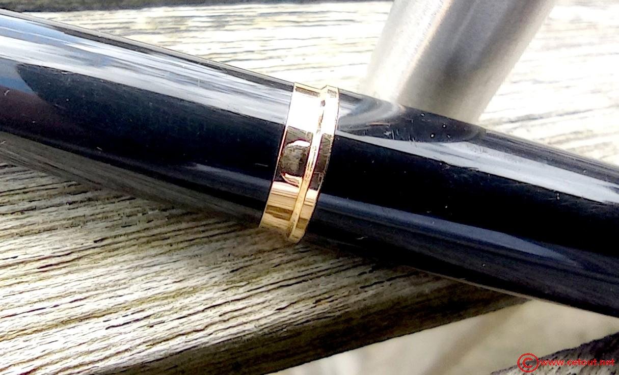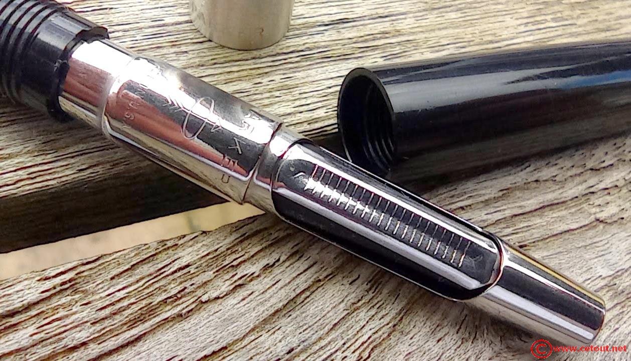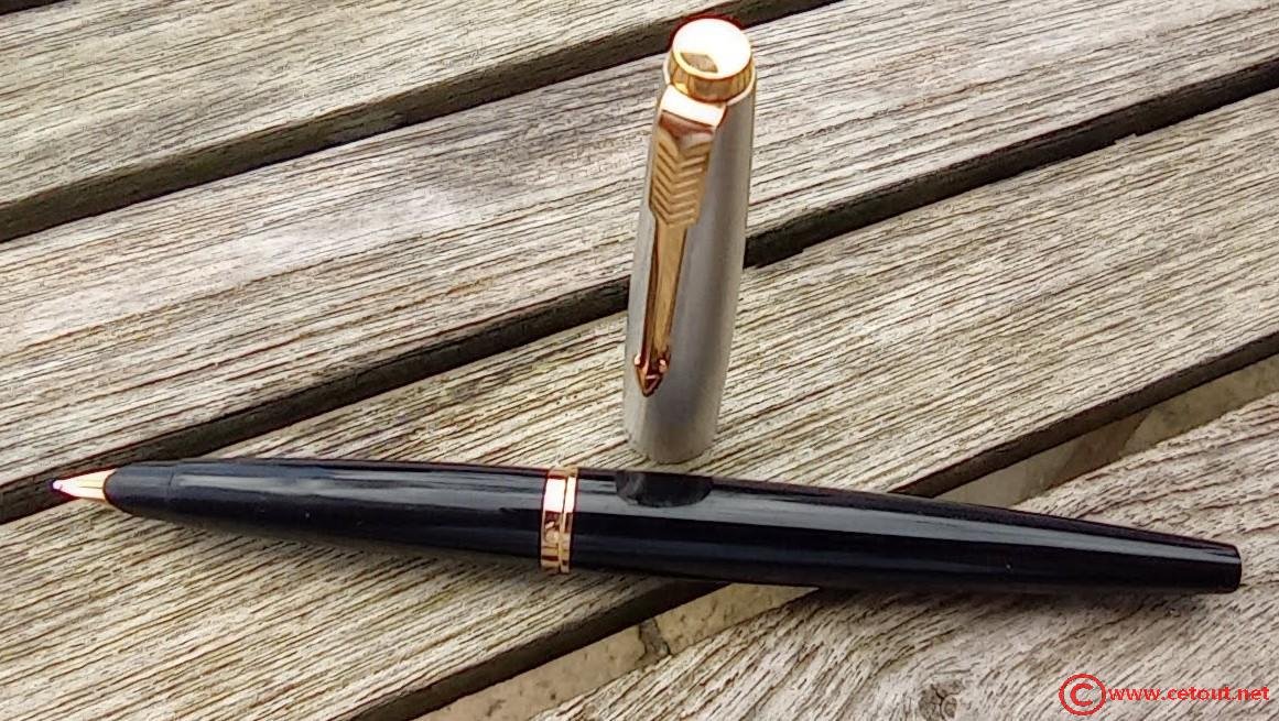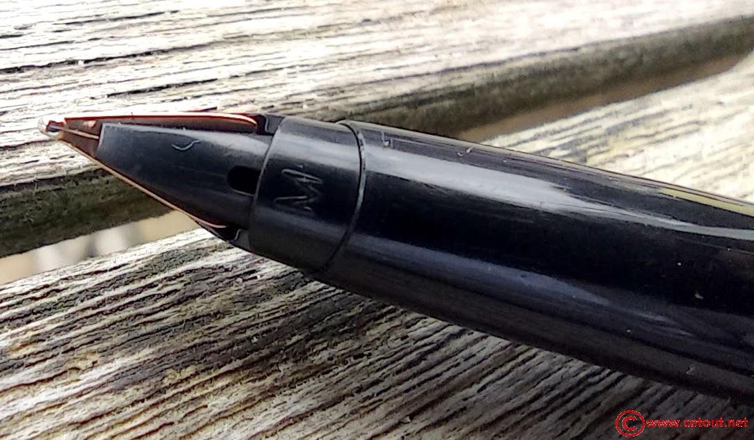 – Capuchon (intact) – métal brossé – agrafe flèche . Bague au sommet. Inscriptions : « Symbole flèche et cercle » suivi de « PARKER – MADE IN USA »