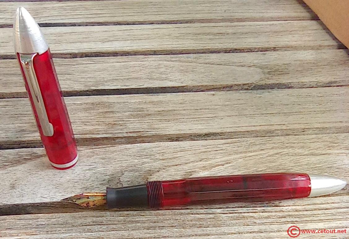 DANS SON JUS : STYLO PLUME INCONNU PLASTIQUE TRANSPARENT ROUGE ET ALUMINIUM – FRANCE?