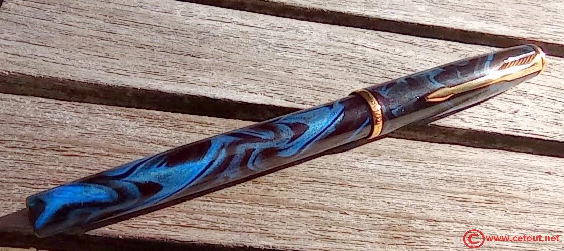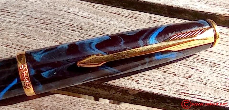 – Capuchon – Laqué Marbré bleu – agrafe flèche plaqué Or. Bague dorée au sommet. Bague avec gravure Parker à la base du capuchon.
