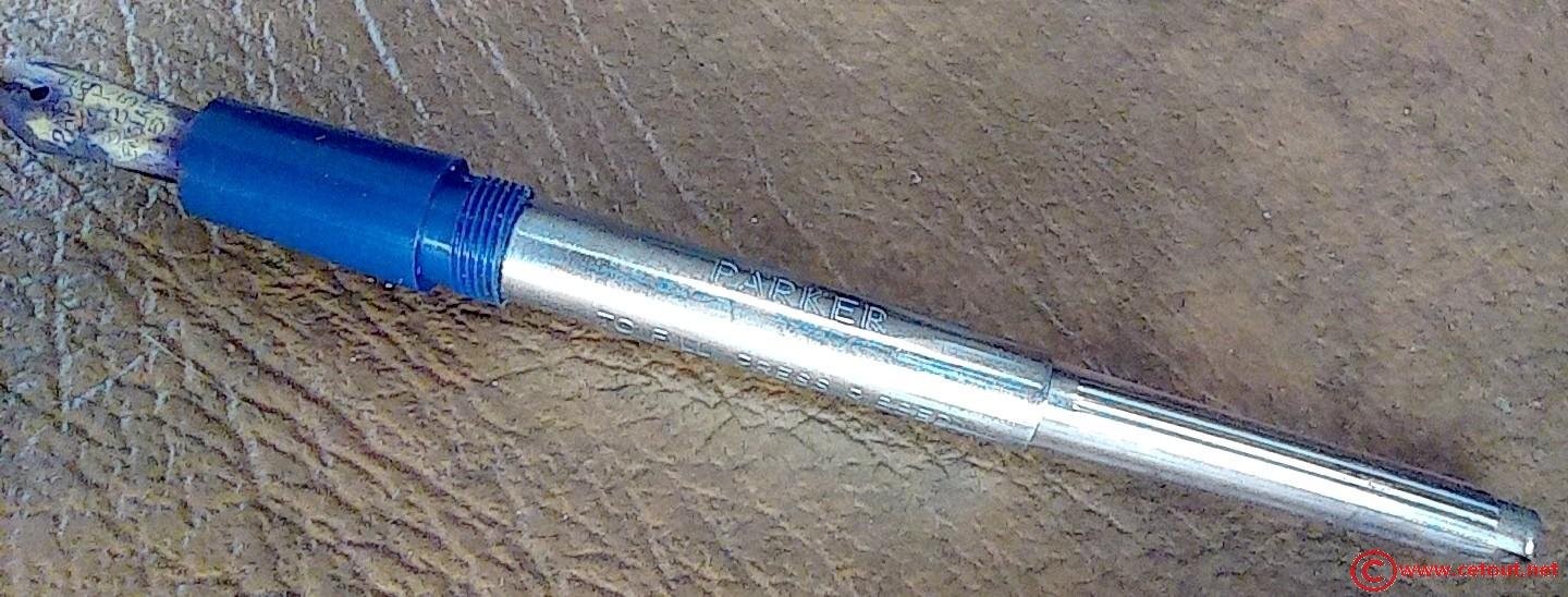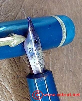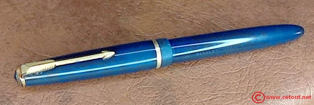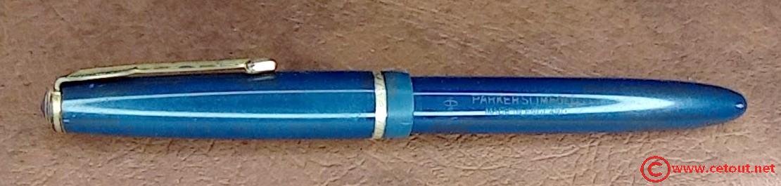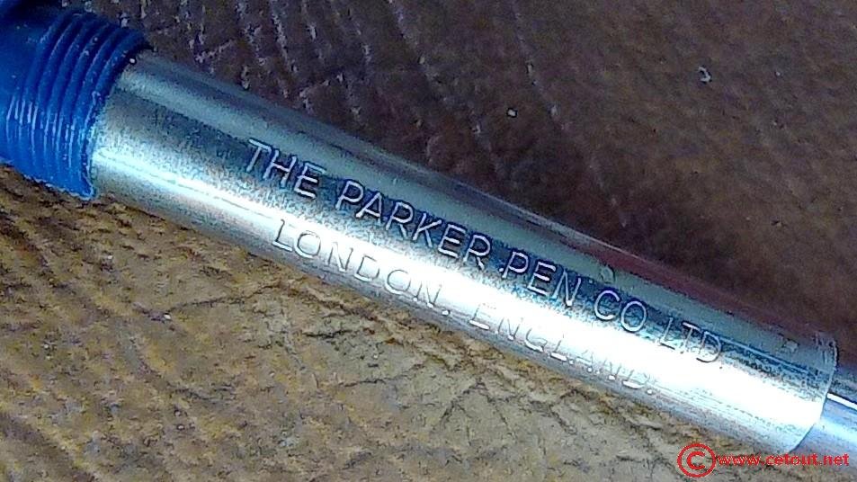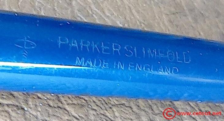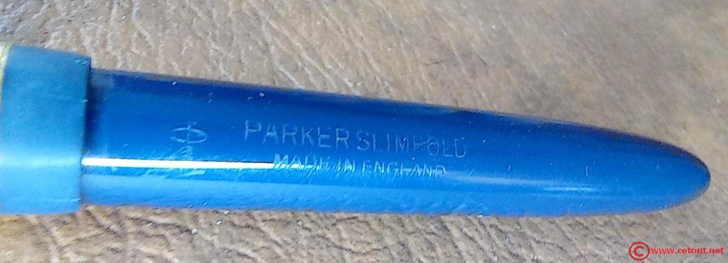 – Corps Celluloïd(?) bleu. Inscription « LOGO + PARKER SLIMFOLD MADE IN ENGLAND »