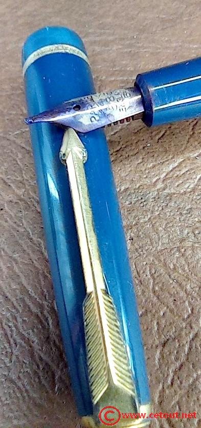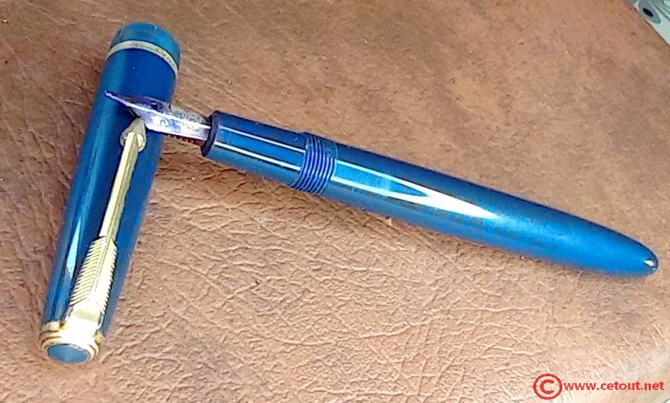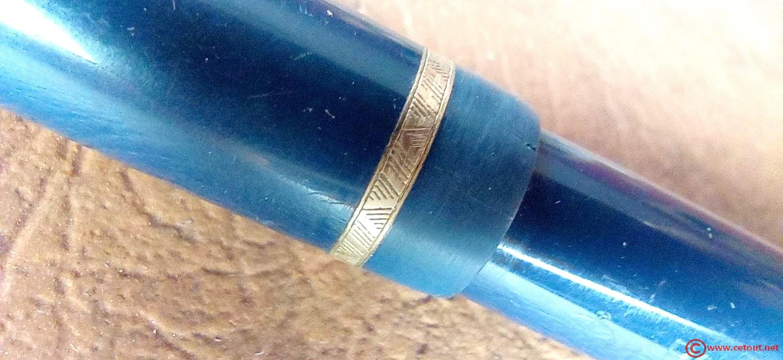 – Capuchon (très légères éraflures) – Celluloïd(?) bleu – agrafe flèche plaqué Or. Bague dorée au sommet. « Jewel » bleue. Base du capuchon à lustrer car apparemment a subi un frottement important.