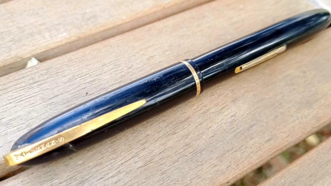 – Bloc plume Celluloïd Noir. Plume dorée avec comme inscription :
