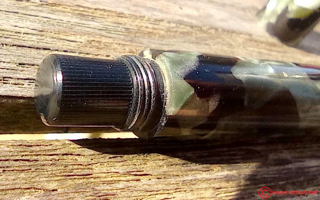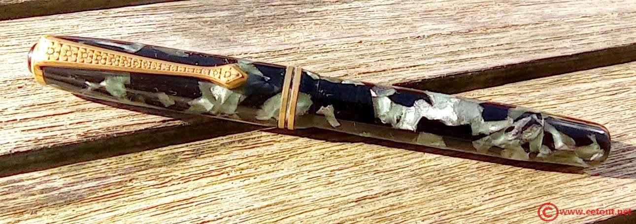 Corps : CELLULOID marbré vert-noir. Mécanisme à pompe à piston (bouton rotatif caché par un capot de même matière que le corps). Fonctionnement à voir.
