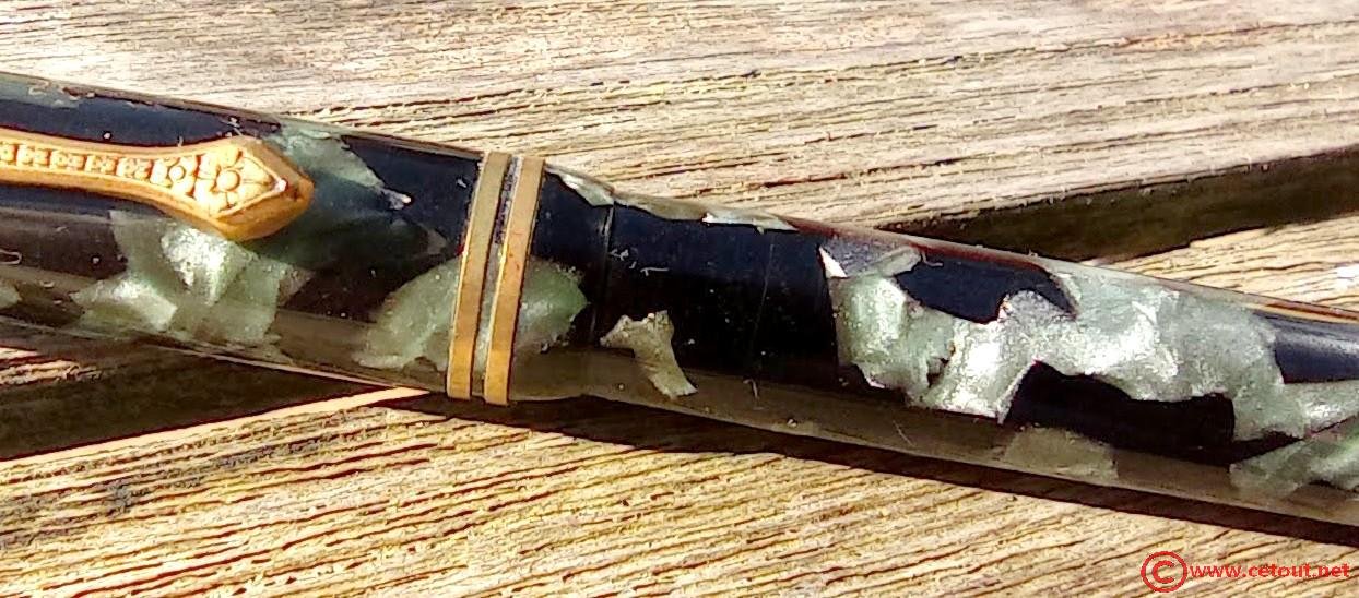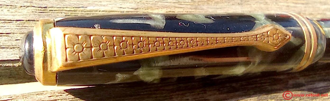 Capuchon : CELLULOID marbré vert-noir. Agrafe métal doré motifs fleurs. 2 bagues à la base du capuchon. Très bon état.