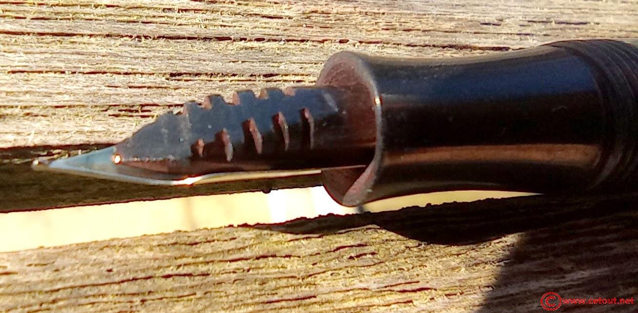 Bloc section CELLULOID (ou ébonite) Noire . Plume métal “Iridium + tête d’animal (tigre?)+écriture TI..ED”.