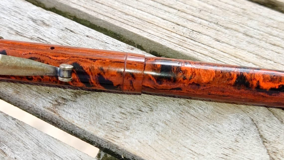 – Capuchon en Ebonite marbrée WOODGRAIN. Clip métal . Bague blanchâtre au sommet. Bon état global.