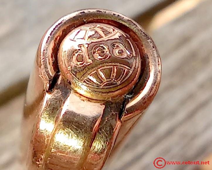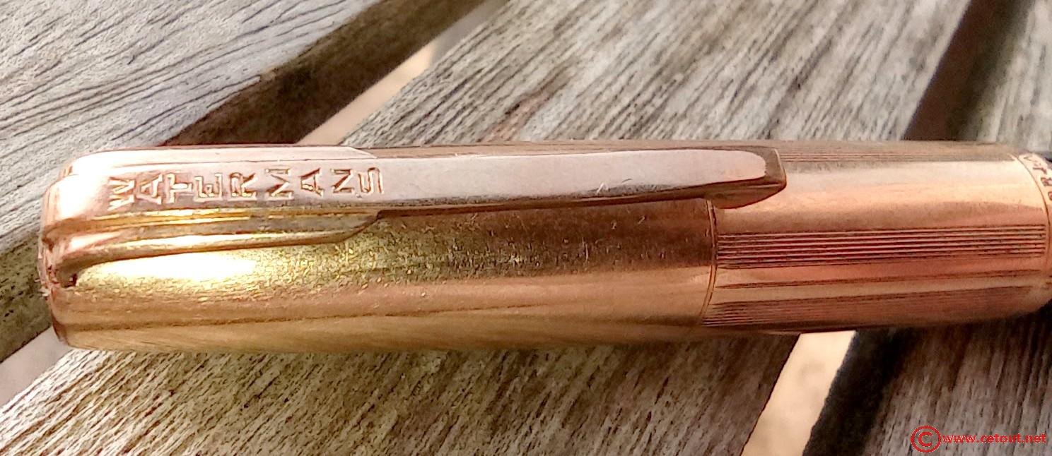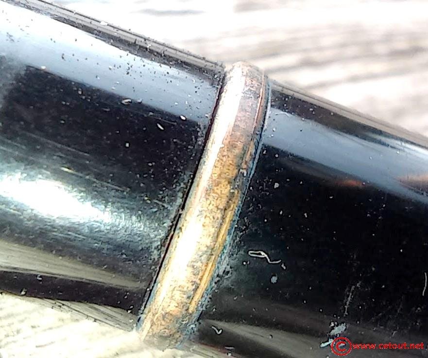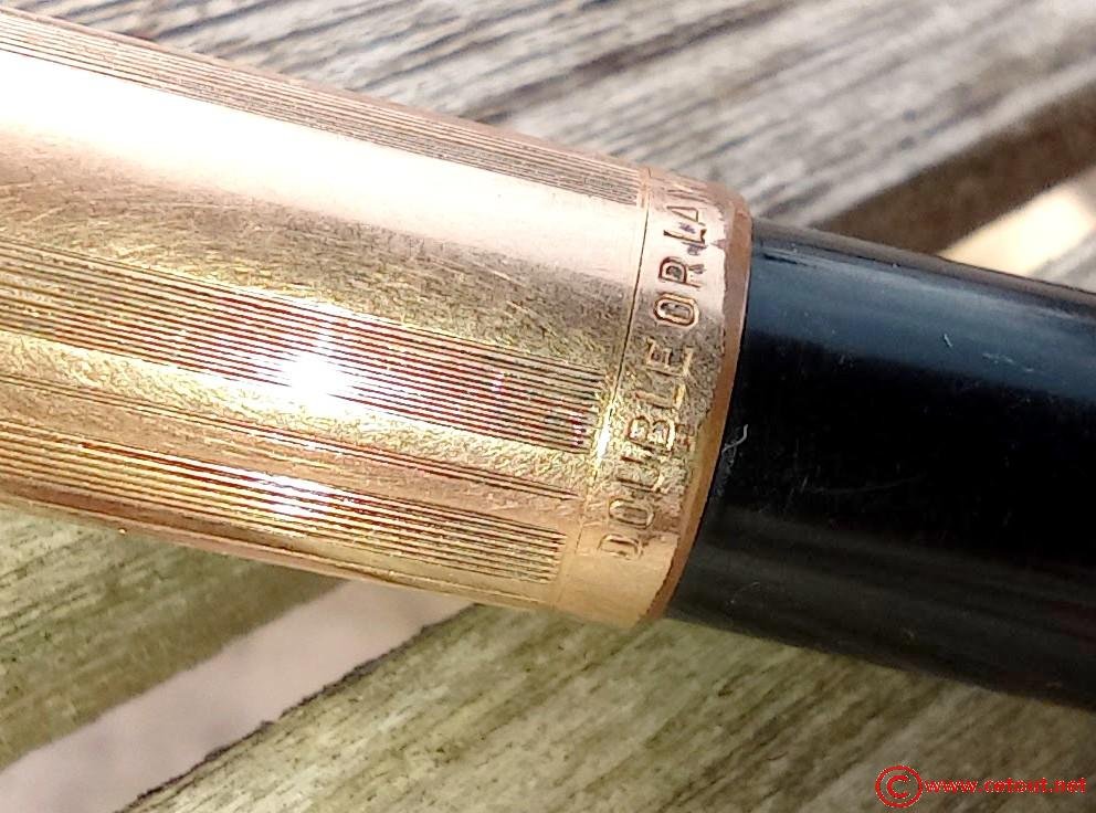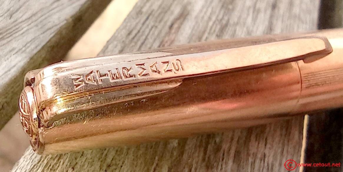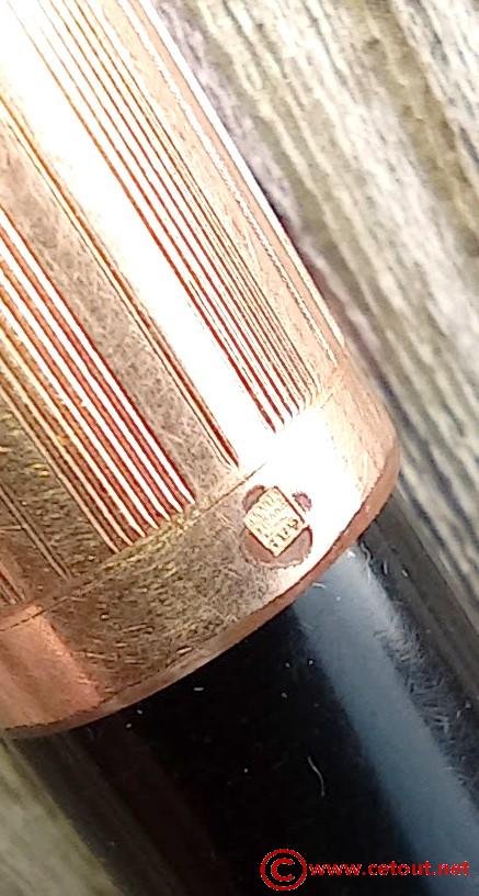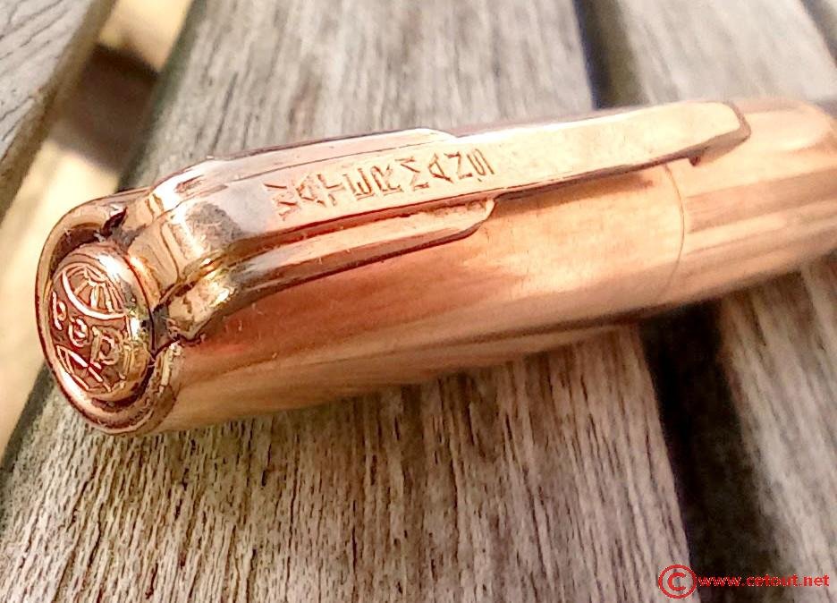 – Capuchon en Métal DOUBLE LAMINE OR, clip métal doré avec inscription WATERMANS. Inscription gravée à la base : « DOUBLE OR LAMINE» avec un poinçon (élimé aux bords). Gravure IDEAL dans un cercle sur le sommet du capuchon.