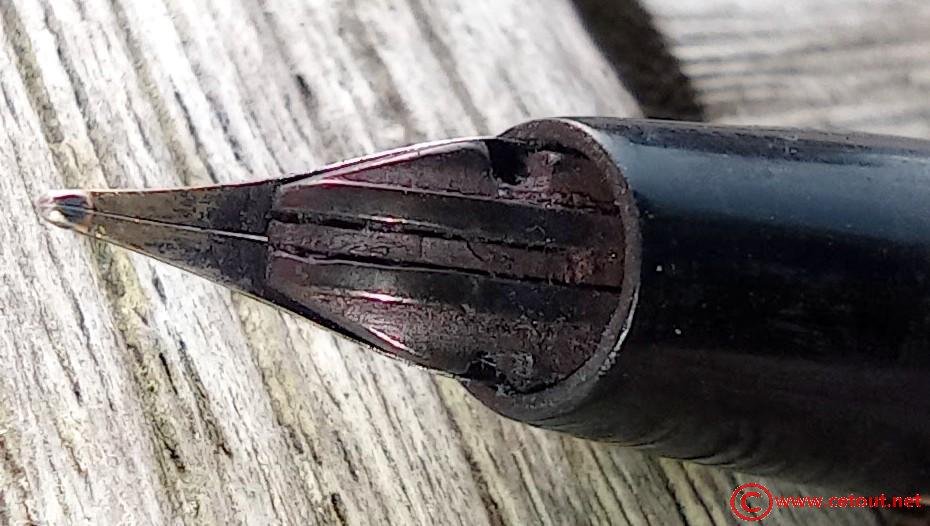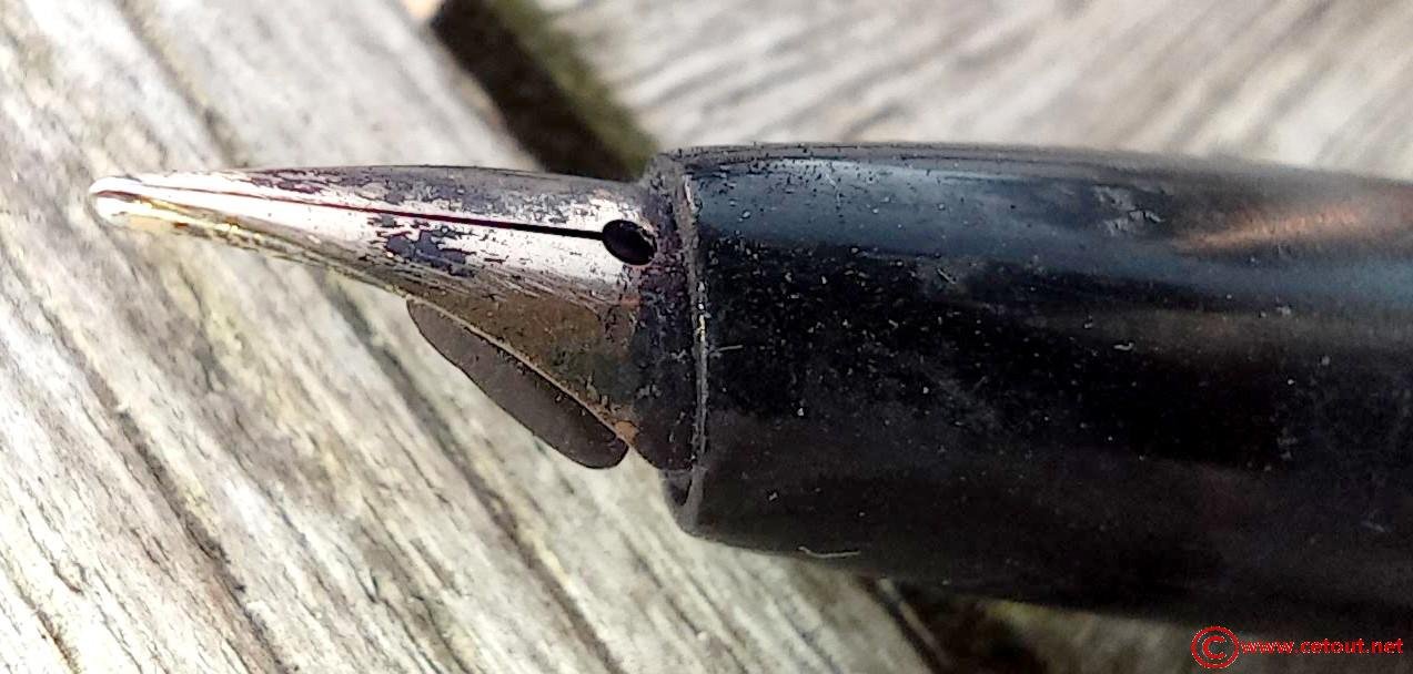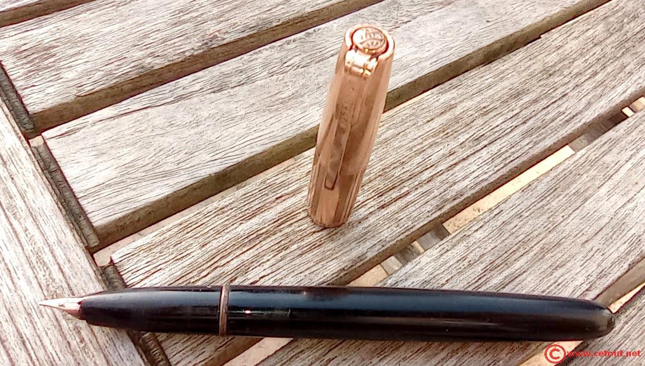 – Bloc plume résine noire. Plume dorée très probablement d’origine WATERMAN carénée.
