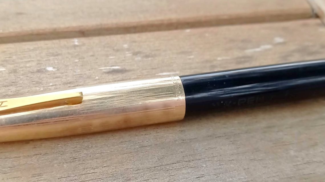– Capuchon en métal doré cannelé sur sa moitié et gravé : “double laminé OR” avec poinçon au verso. Clip métal doré avec inscription « XPEN ». Quelques traces d’usure. Bon état global.