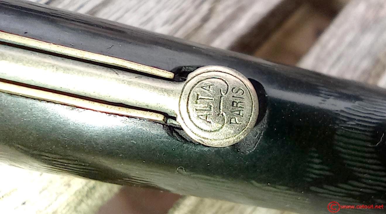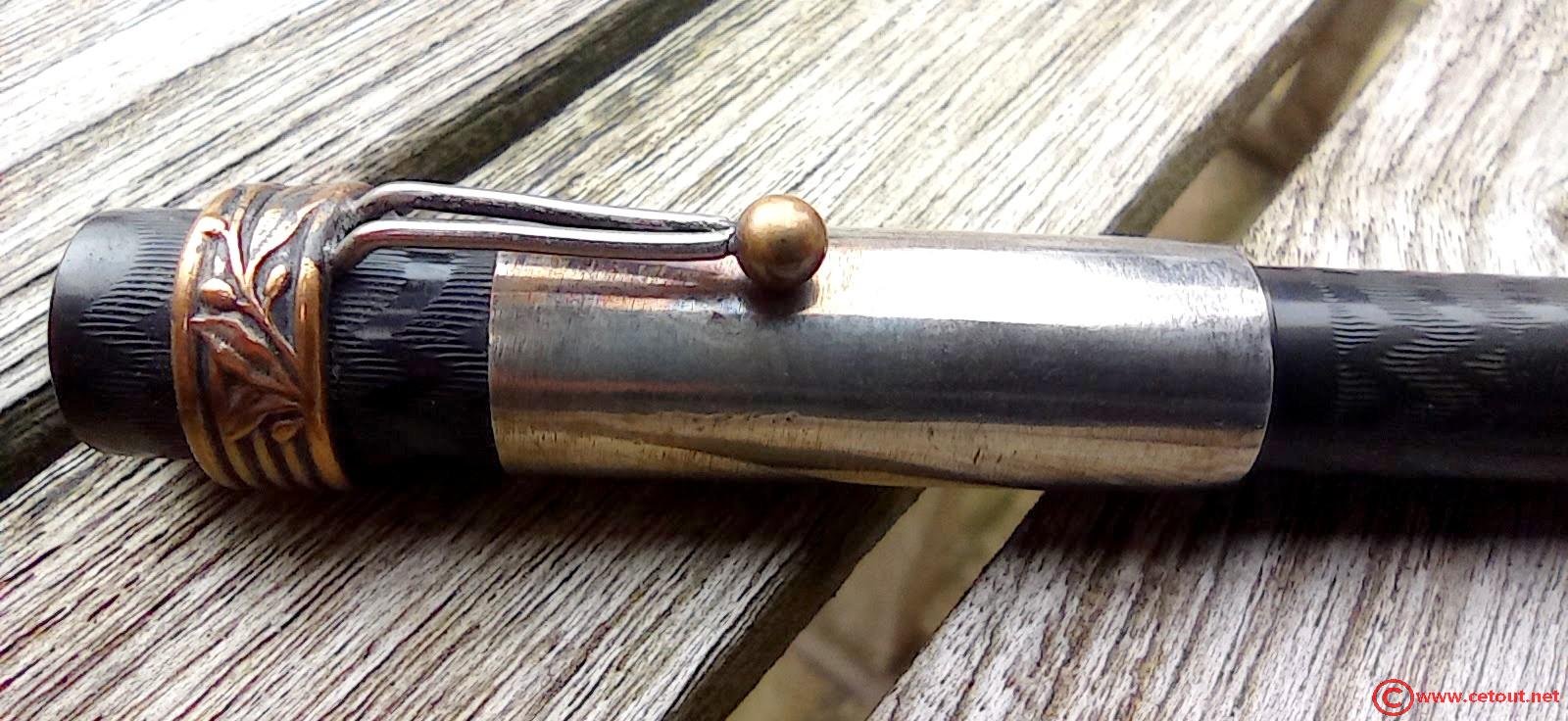 Son corps et capuchon en font un waterman’s 52. Le capuchon a été abimée et restauré avec un ajout d’un habillage métallique (matière indéterminée mais qui ressemble à de l’argent). Son levier est un levier estampillé ALTA-PARIS et sa plume est une warranted 18 CTS Made in USA 3…