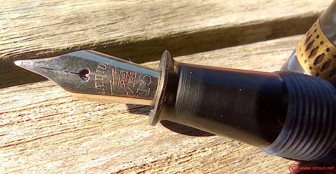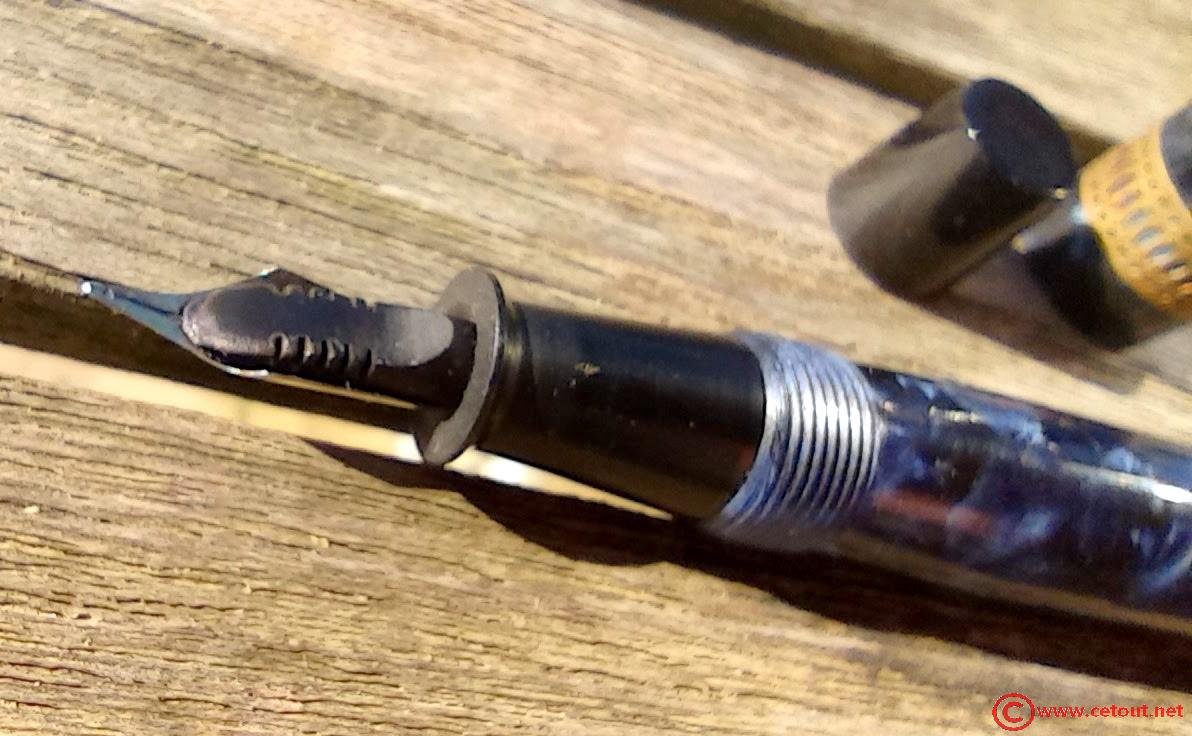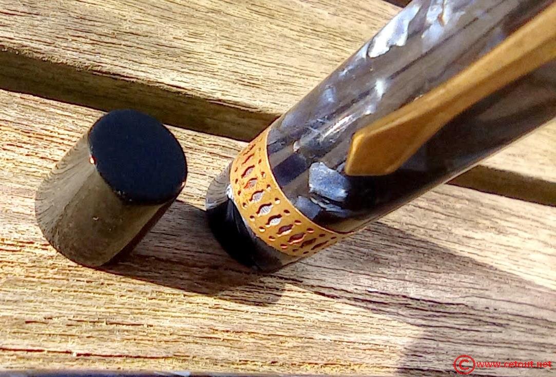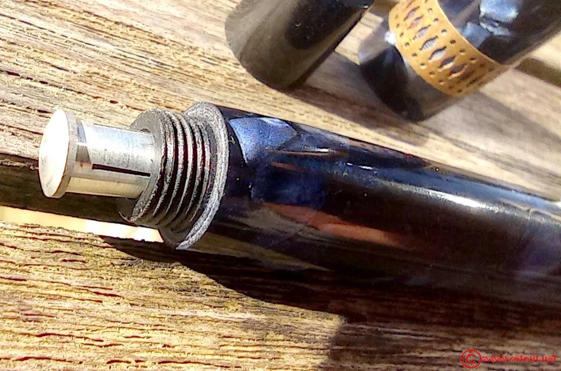 - Cabochon en matière noire (Ebonite ou celluloïd?) dévissable et qui protège le bouton de la pompe (à changer).