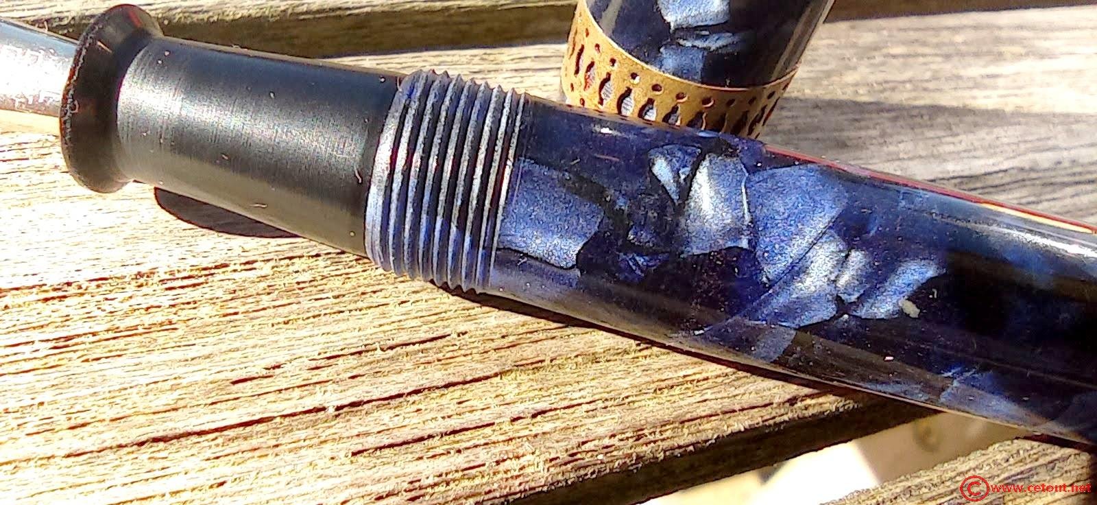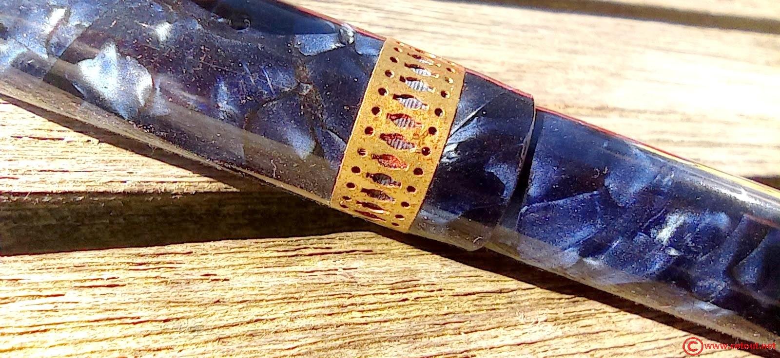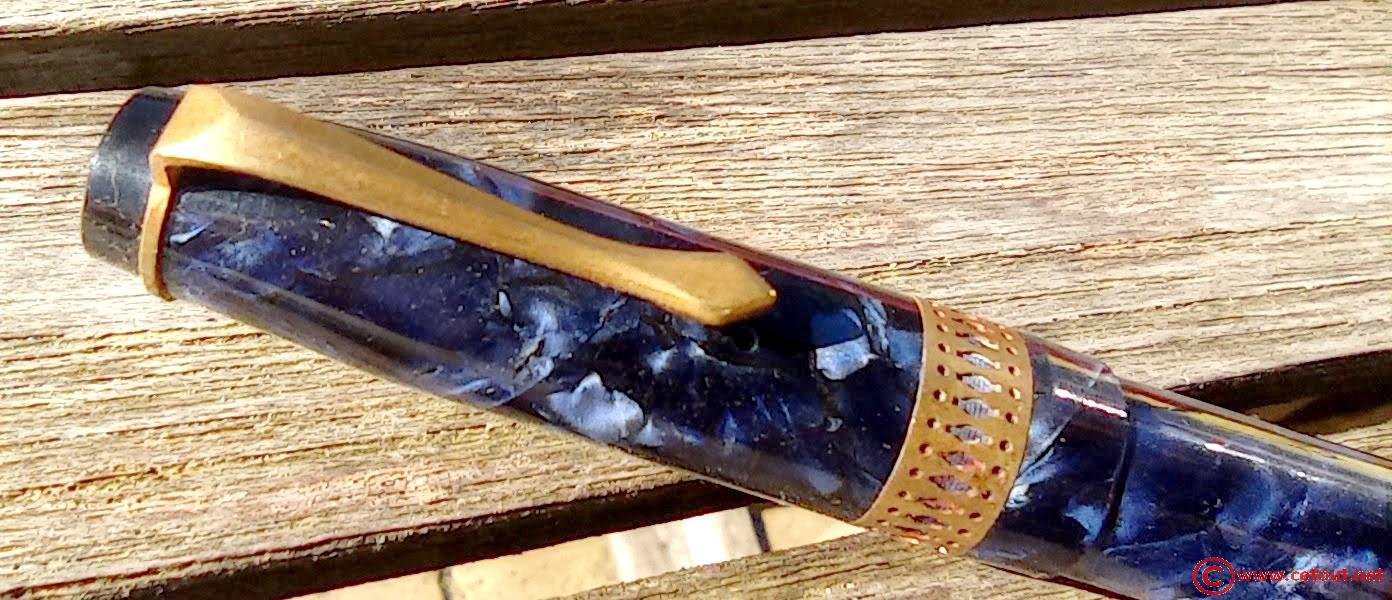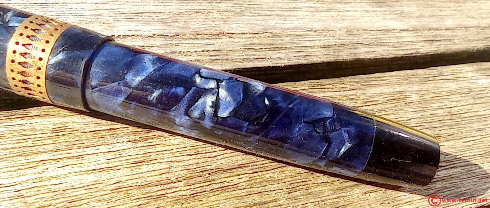 - capuchon celluloïd Marbré Bleu avec 1 bague métallique dorée typique à la base (Très bon état). Clip métallique en métal doré. Cabochon en matière noire (Ebonite ou celluloïd?).