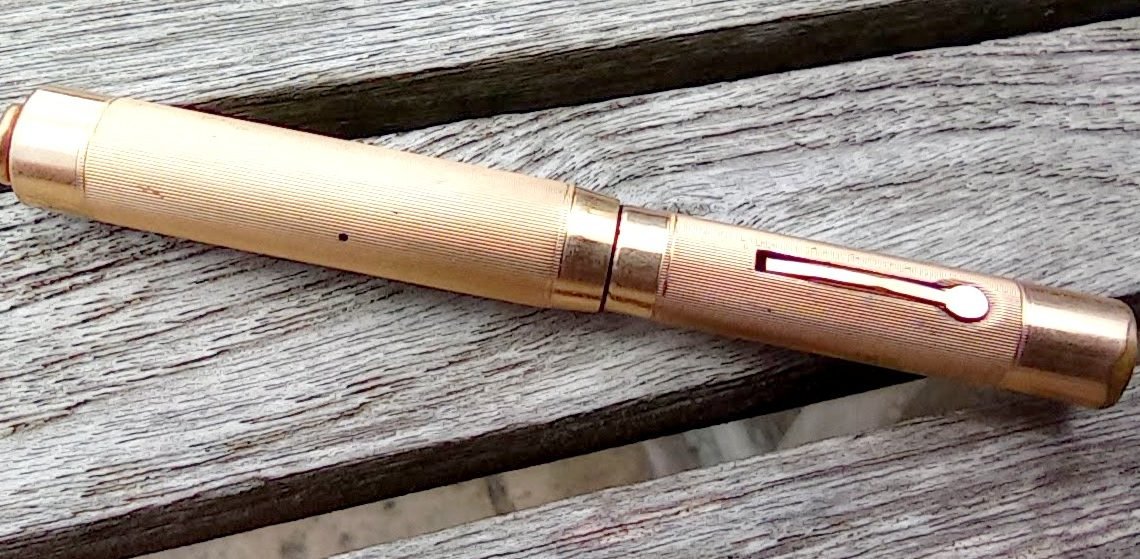 – Capuchon métal plaqué Or (avec bélière). Cannelures fines. Gravure au sommet du capuchon : “WAHL PEN” surmontant “GOLD FILLED MADE IN USA”