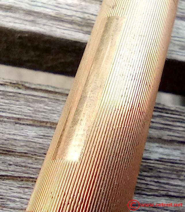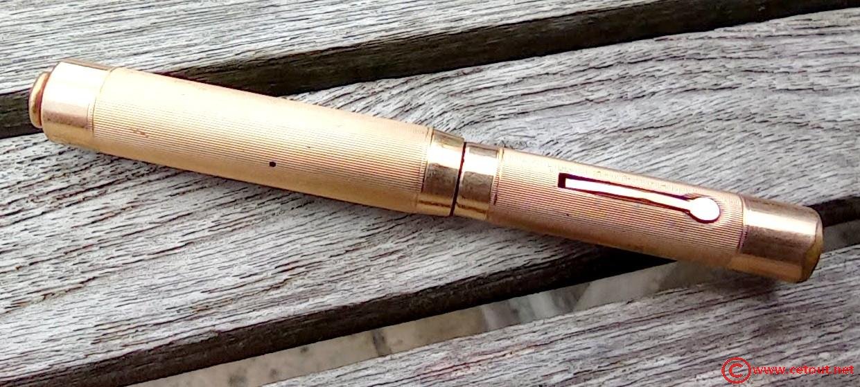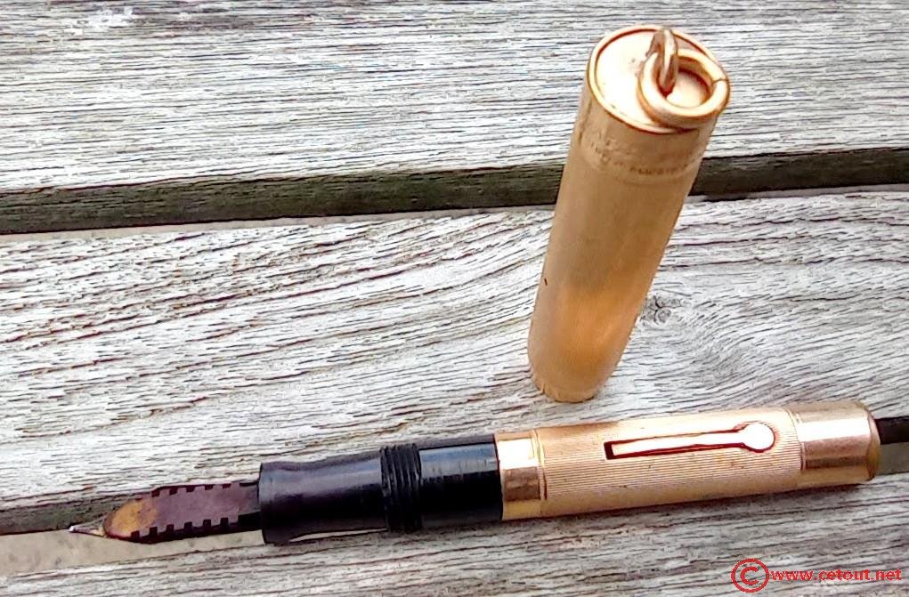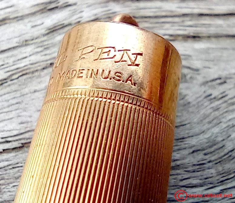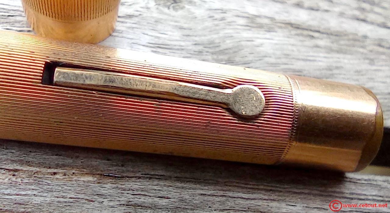 – Capuchon métal plaqué Or (avec bélière). Cannelures fines. Gravure au sommet du capuchon : “WAHL PEN” surmontant “GOLD FILLED MADE IN USA”