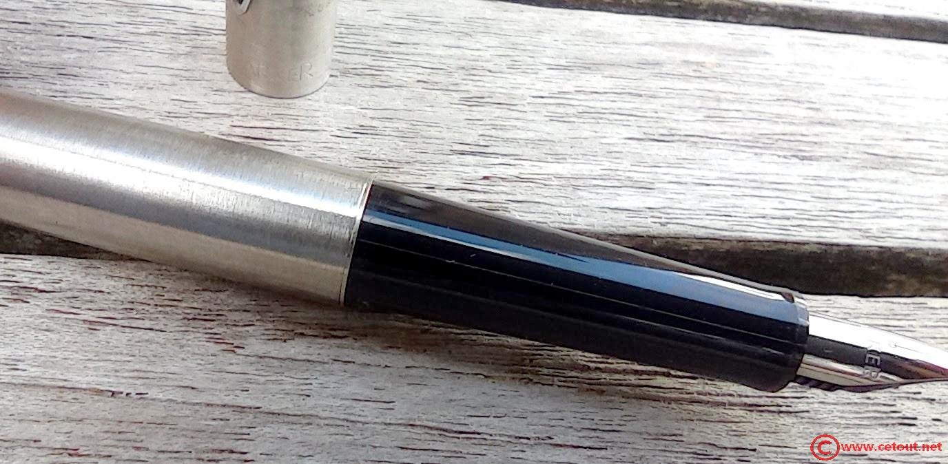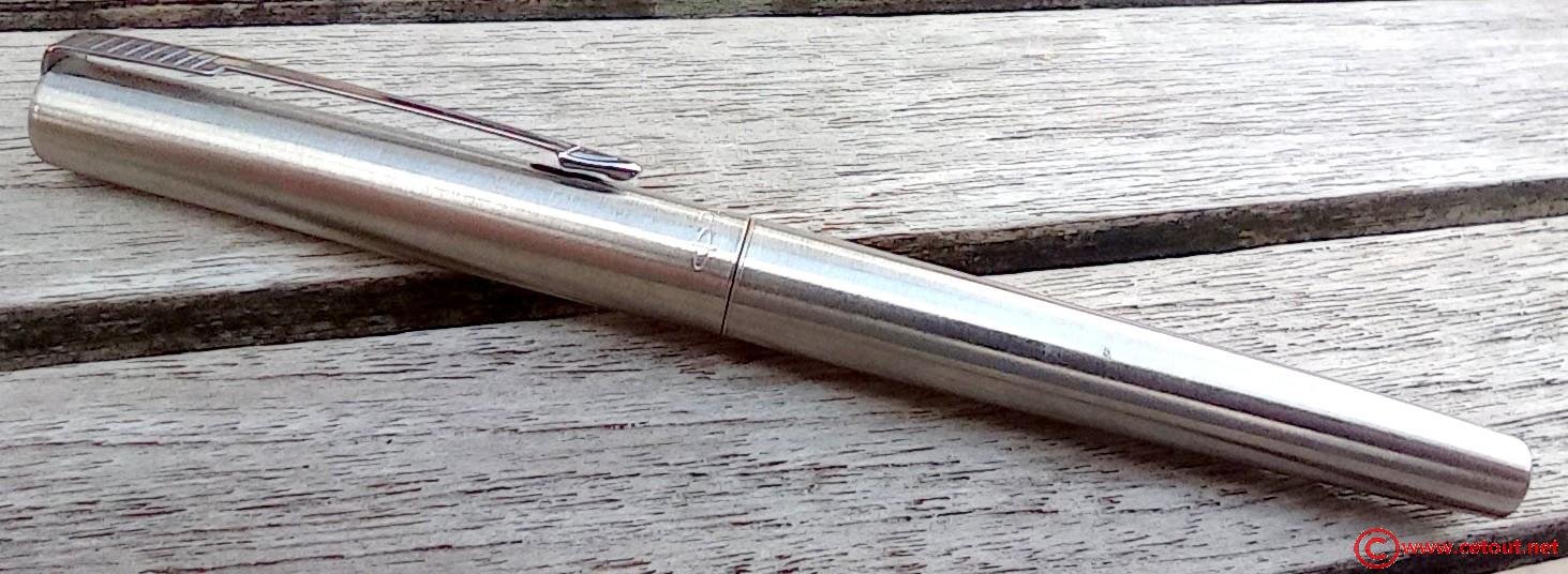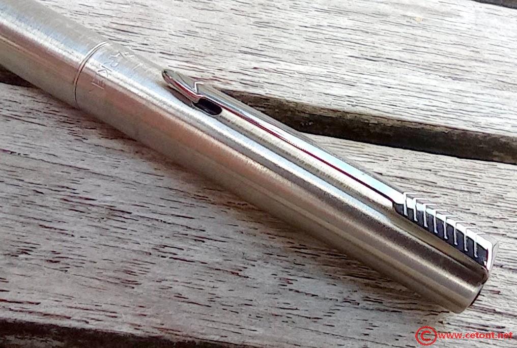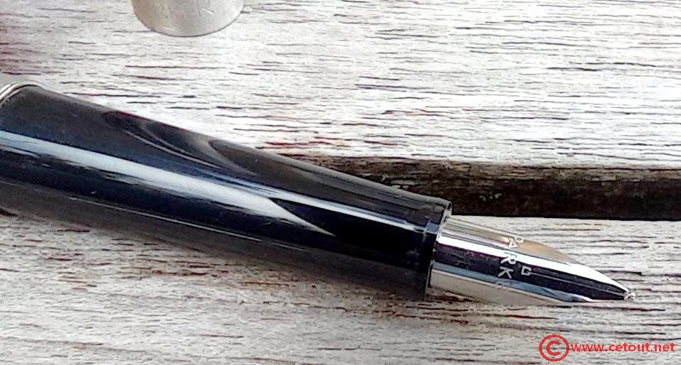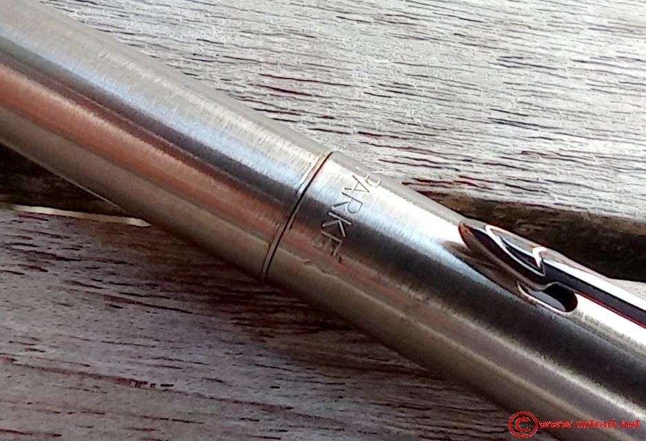 – Capuchon (intact) – métal brossé – agrafe flèche . Inscriptions : « Symbole flèche et cercle » suivi de « PARKER – MADE IN UK »