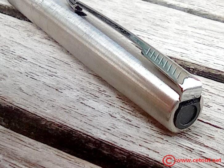 – Corps Plastique métal brossé. Forme se terminant par un orifice dans une extrémité concave. Une bague métal sépare le corps du capuchon avec clip de maintien.