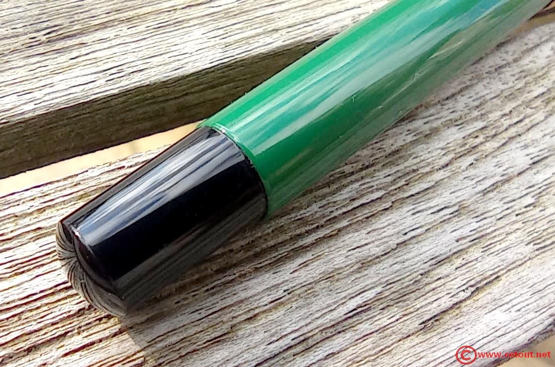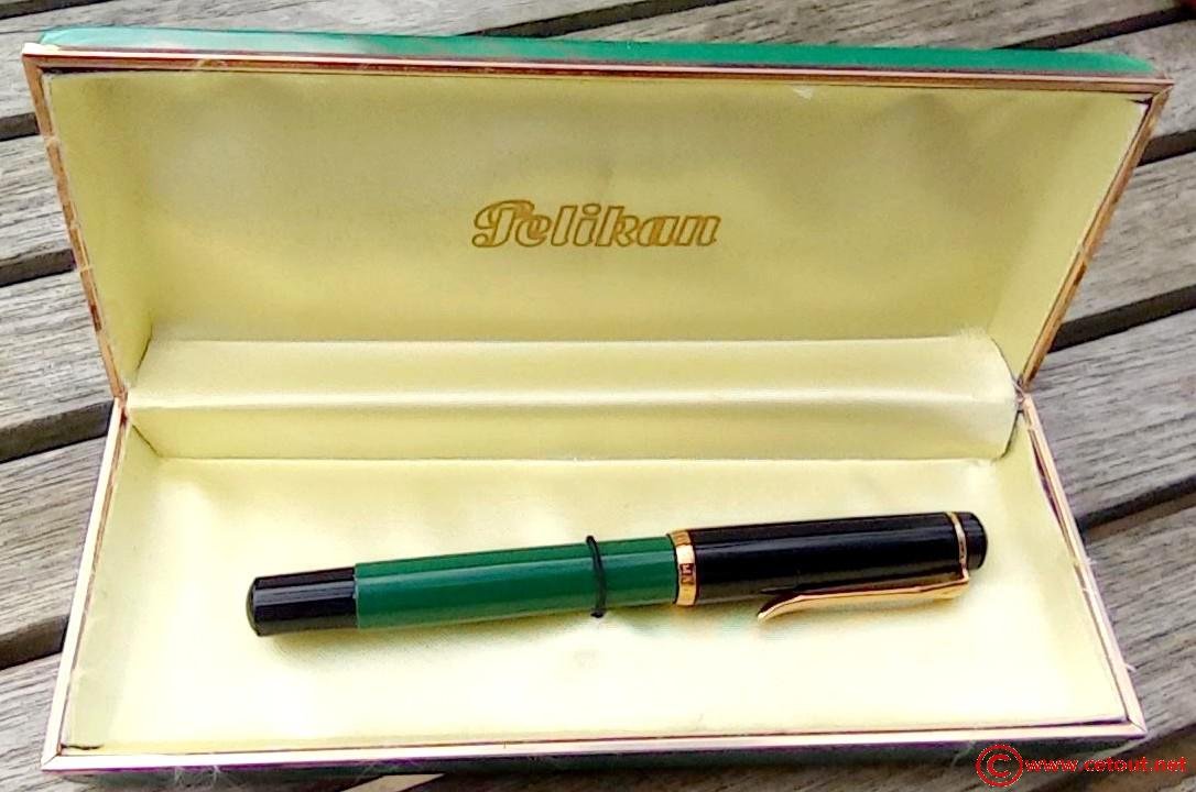 – Bloc plume Plastique VERT : Plume originale dorée gravée « Pelikan » stylisé puis logo Pelikan puis M.