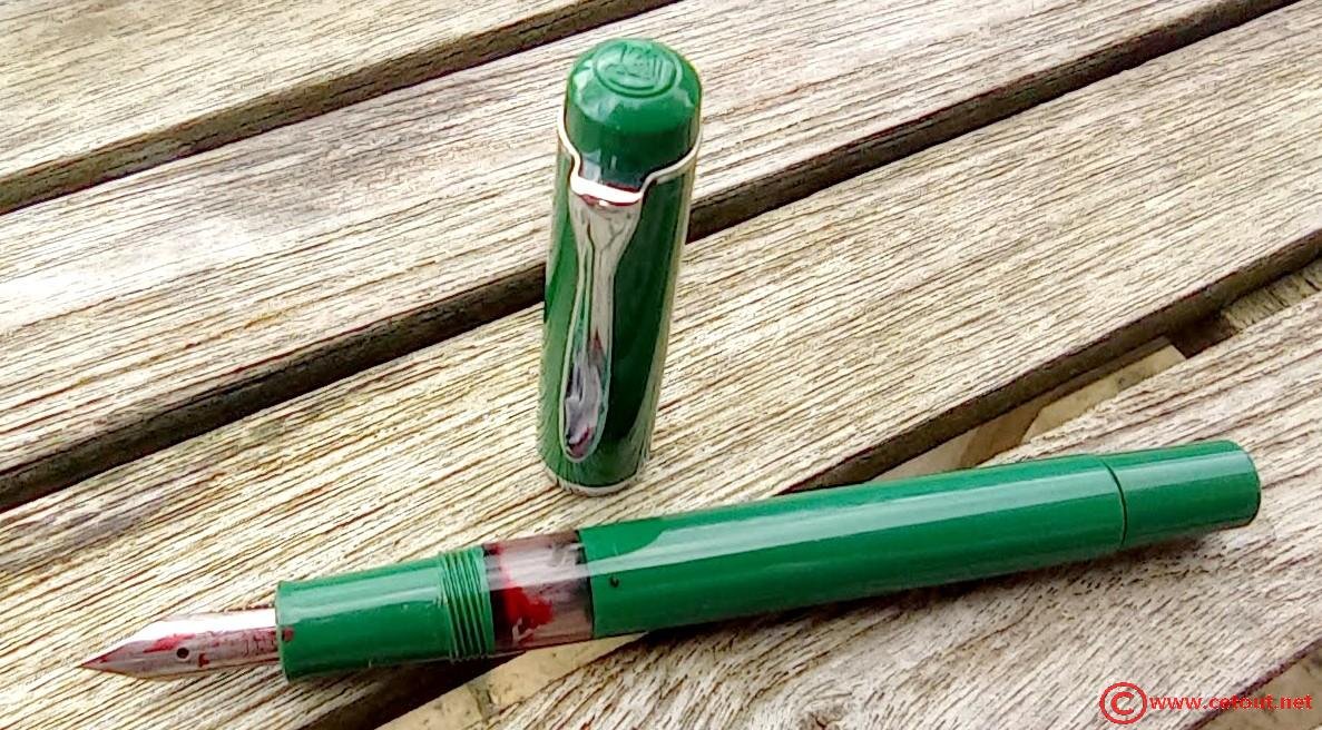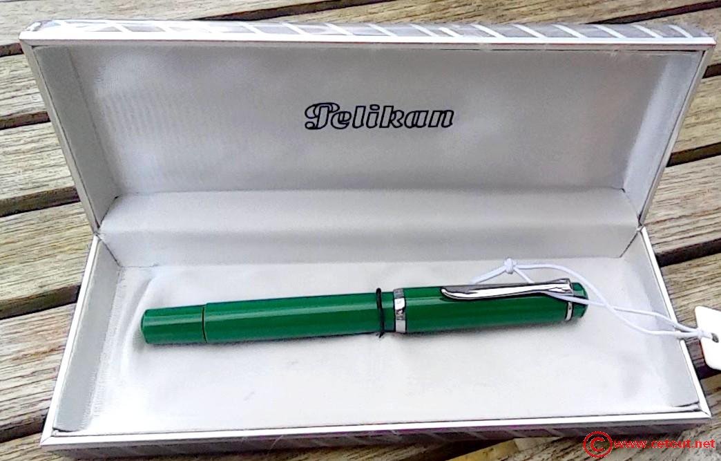 – Bloc plume Plastique VERT : Plume originale Acier gravée « Pelikan » stylisé puis logo Pelikan puis F.