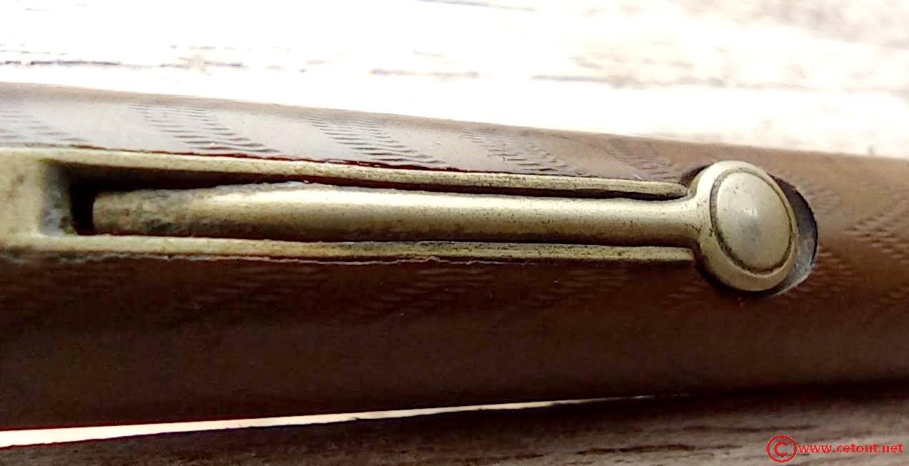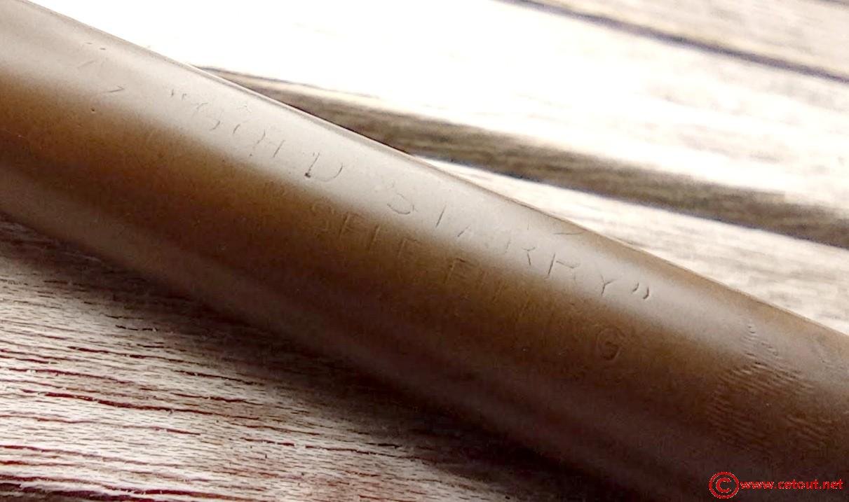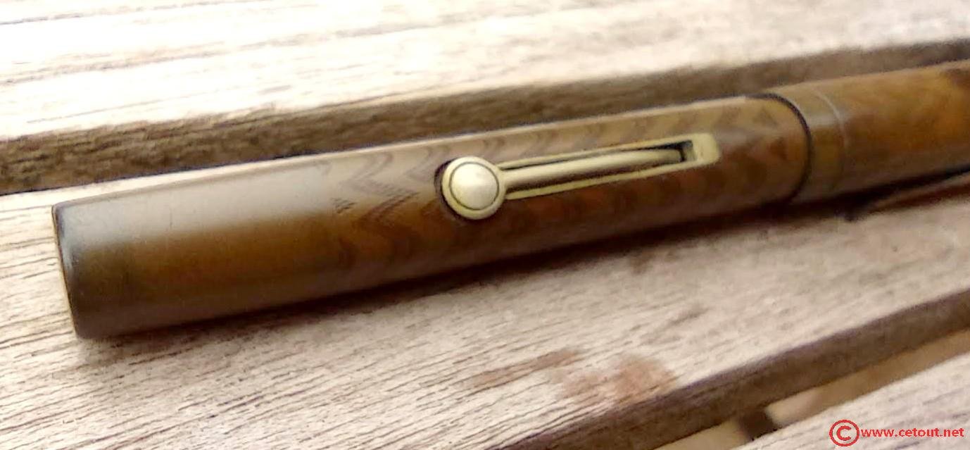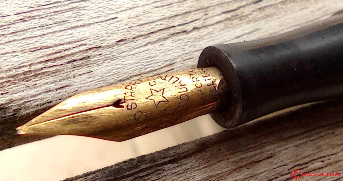 – Corps Ébonite noire décolorée avec motifs chevrons. Il est gravé dans le corps : « GOLD STARRY» suivi de “… SELF FILLING” . Système encre par sac avec levier..