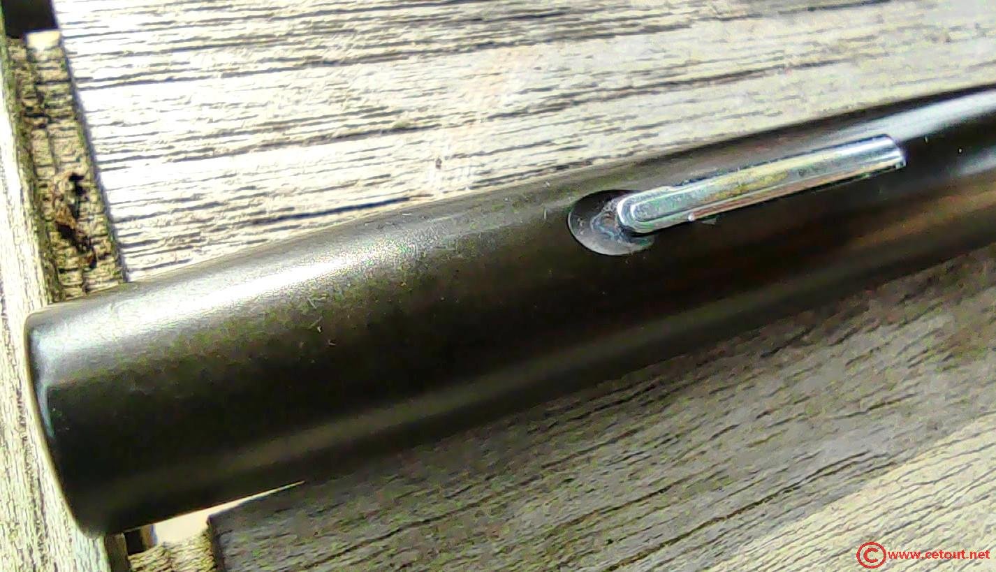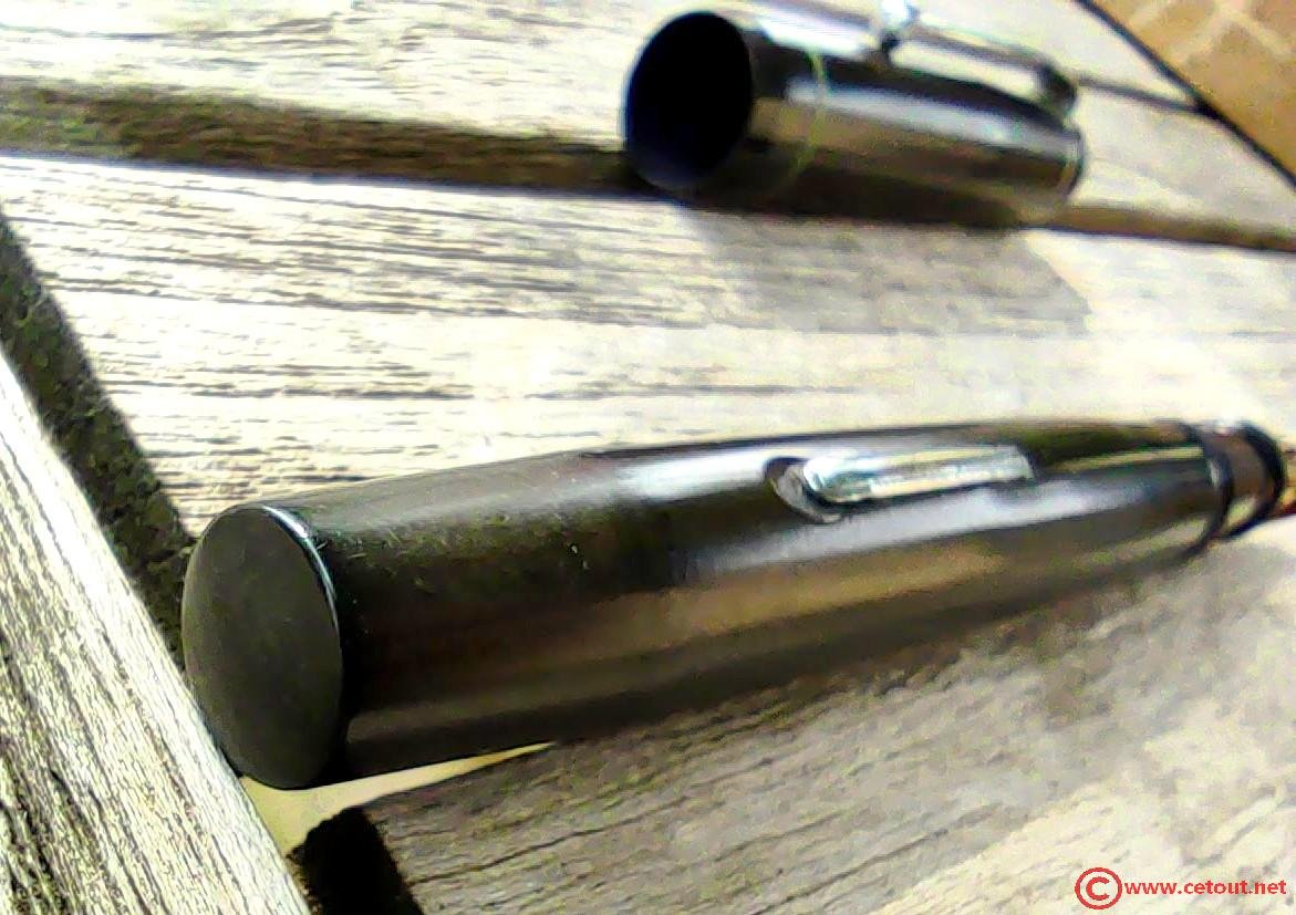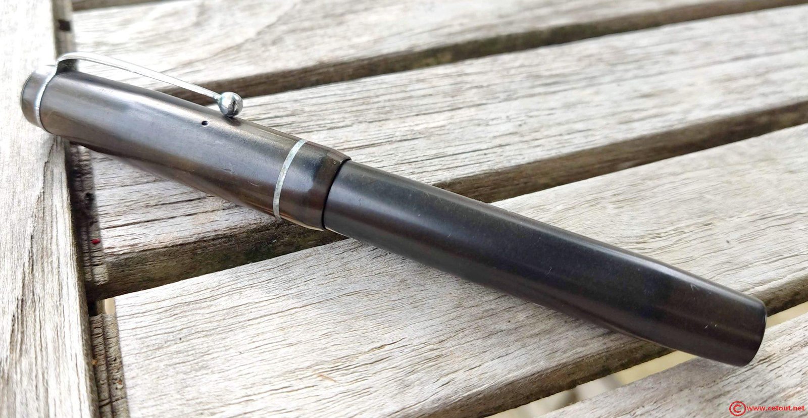 – Capuchon Ebonite Noire un peu décolorée avec agrafe métal  et bague métal à la base du capuchon.