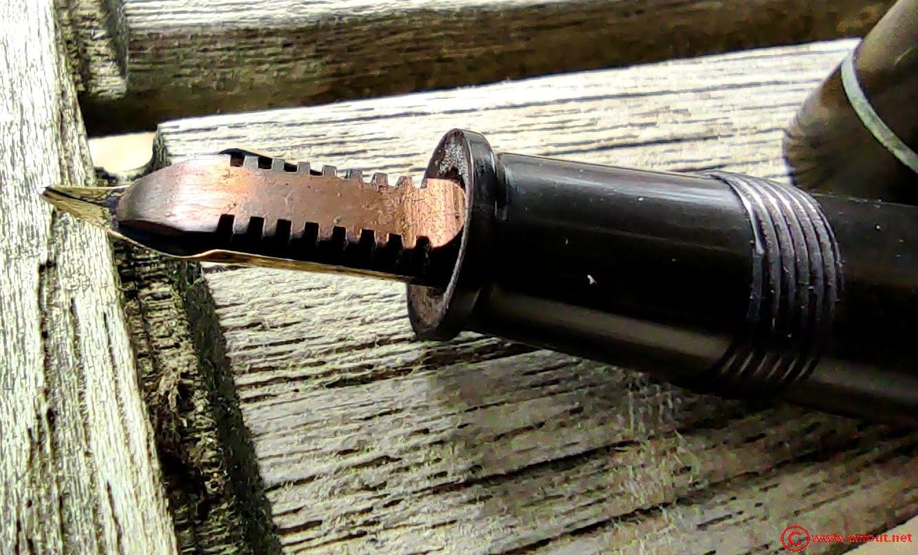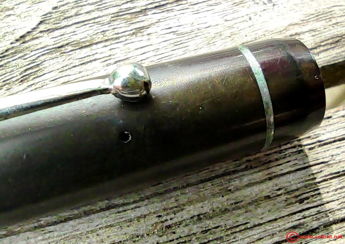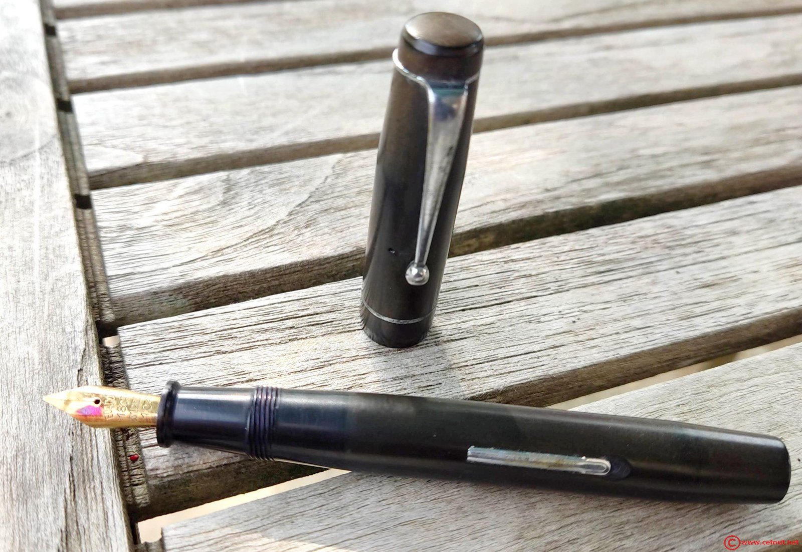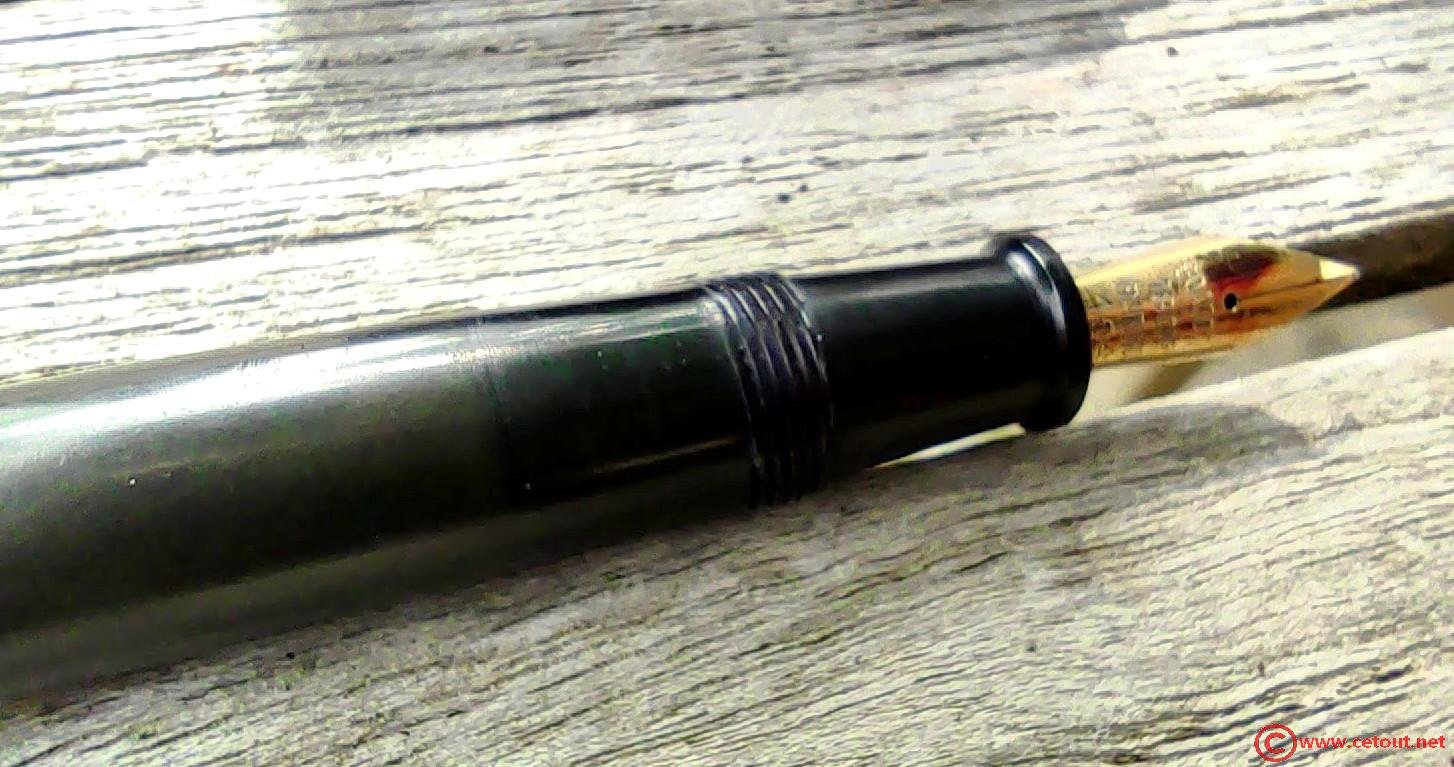 – Capuchon Ebonite Noire un peu décolorée avec agrafe métal  et bague métal à la base du capuchon.