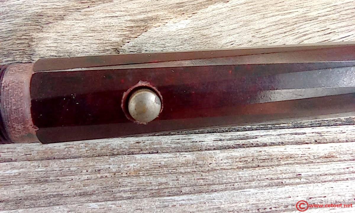 - corps : matière rouge façon bakélite avec un bouton métallique apparent sur le côté. Cabochon a l’extrémité (forme géométrique polygonale).