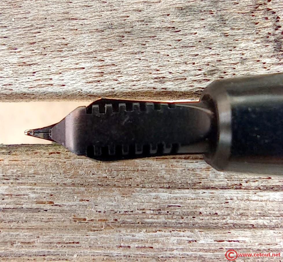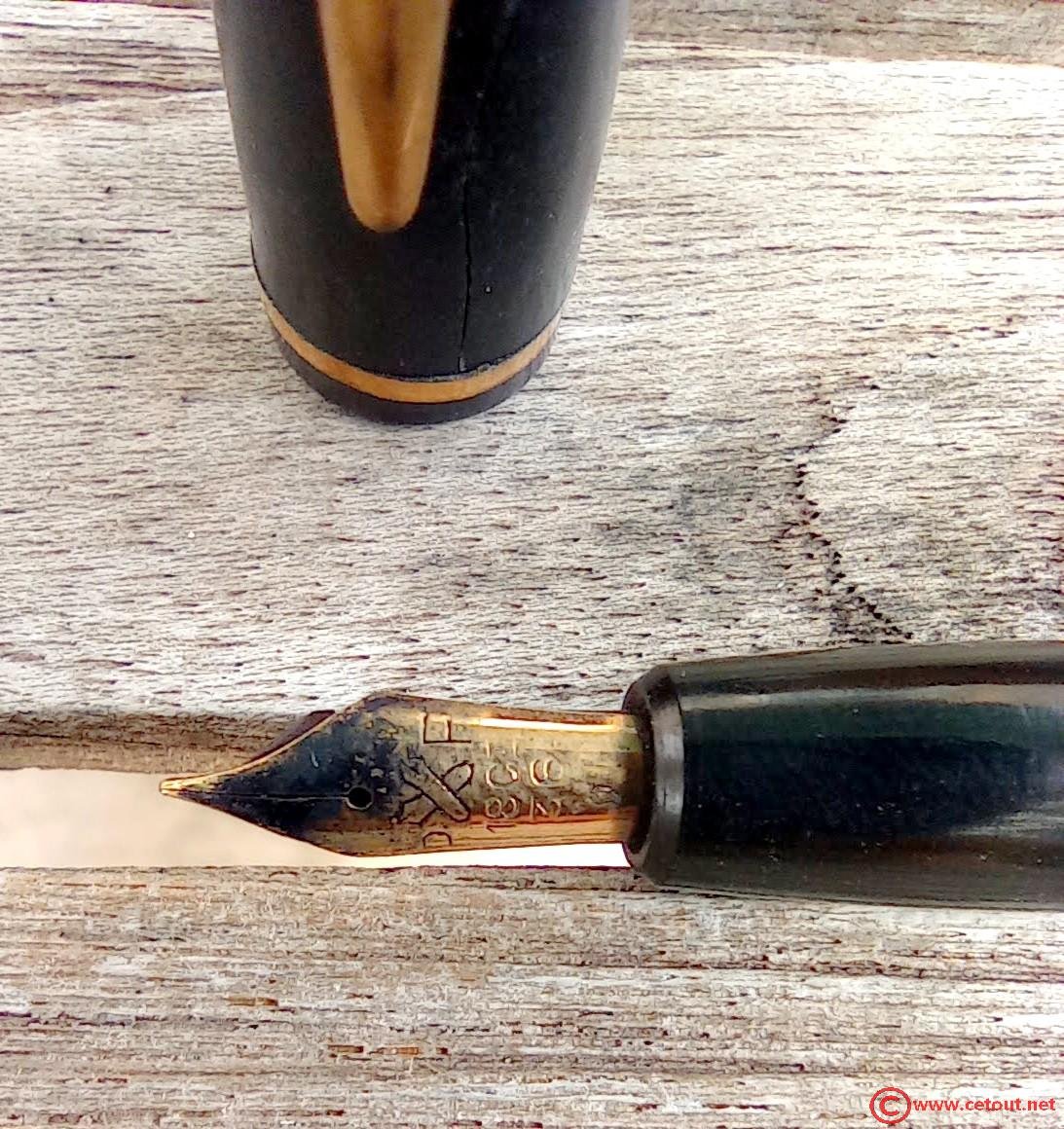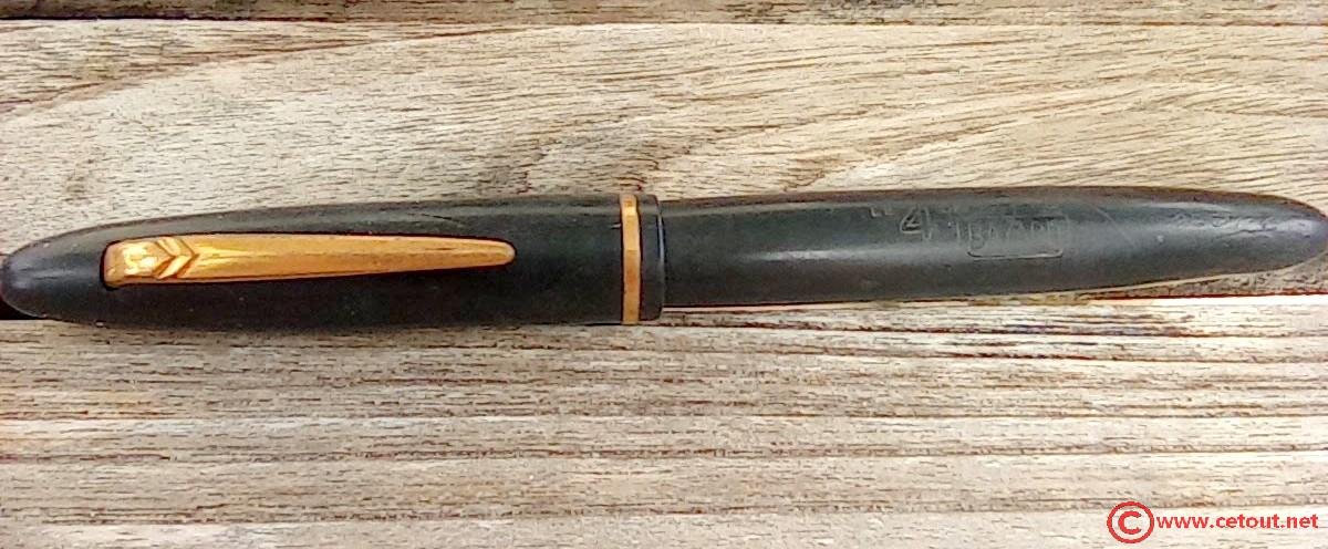 – Bloc plume en ébonite(?) noire. Plume OR. Inscriptions : logo caractéristique des plumes pour BAYARD ( 2 plumes entrecroisées entourées des lettres P et F surmontant « 18 cts » et surmontant à son tour le nombre « 3C».