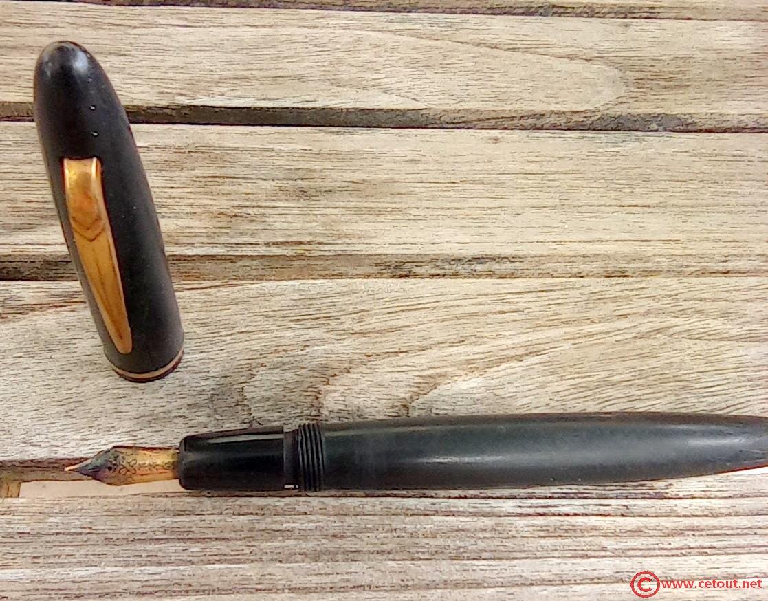 – Capuchon en celluloïd noir. 3 bagues fines à la base. Pas de Clip métal. Bon état global.