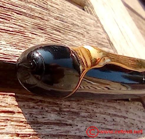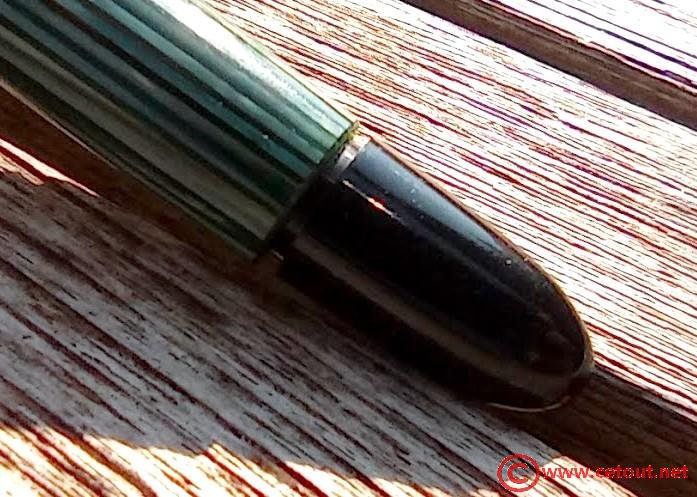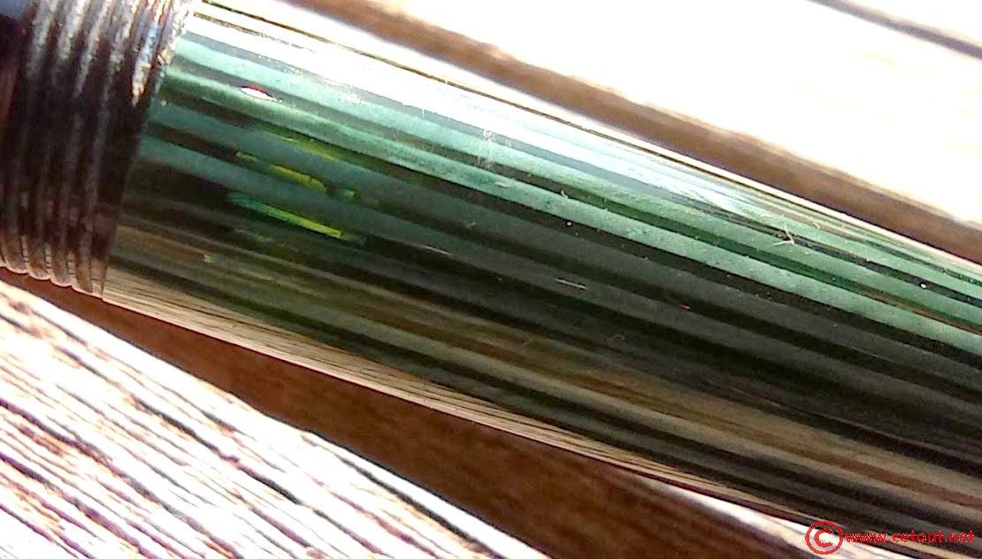 – Corps en rayé vert avec cabochon de piston en celluloïd noir terminant le corps. On peut voir le piston par transparence à la lumière vive.